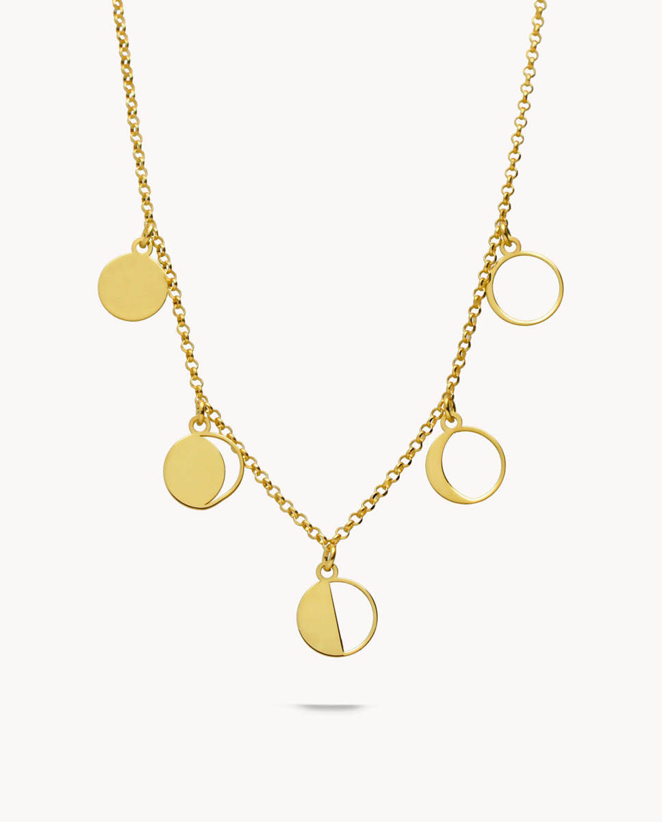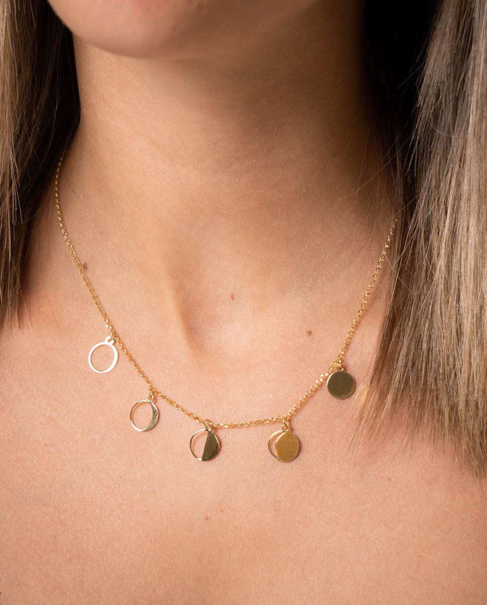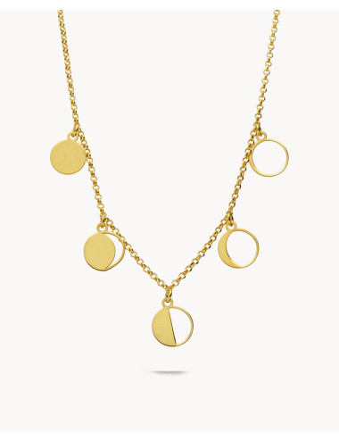 Collar de plata de ley 925 bañada en oro 18k con cinco círculos de 9 mm de diámetro representando las fases de la Luna, largo de 41,5 cms más 3 cms de alargador y cierre de mosquetón.