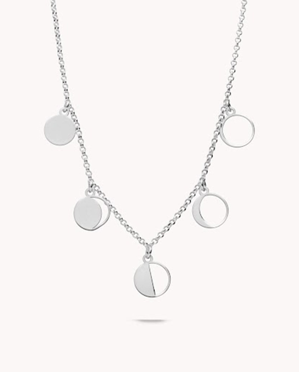 Collar de plata de ley 925 bañada en rodio con cinco círculos de 9 mm de diámetro representando las fases de la Luna, largo de 41,5 cms más 3 cms de alargador y cierre de mosquetón.