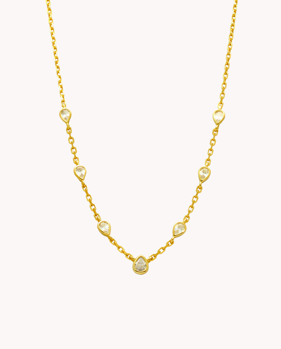 Collar de plata de ley 925 bañada en oro 18K con lágrima central de circonitas blancas de 5 mm y tres lágrimas a cada lado de 3 mm, largo de 35 cms más 3 cms de extensión y cierre de mosquetón.