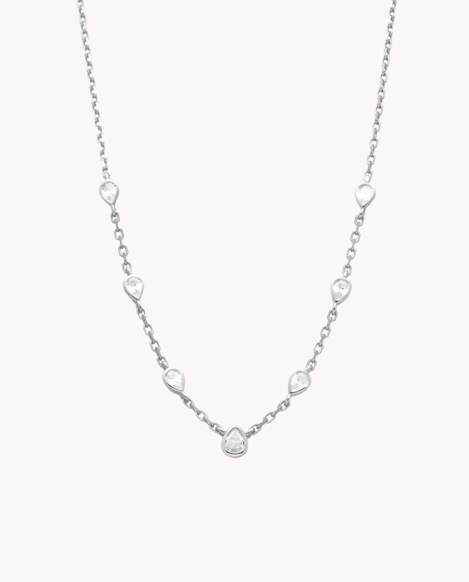 Collar de plata de ley 925 bañada en rodio con lágrima central de circonitas blancas de 5 mm y tres lágrimas a cada lado de 3 mm, largo de 35 cms más 3 cms de extensión y cierre de mosquetón.
