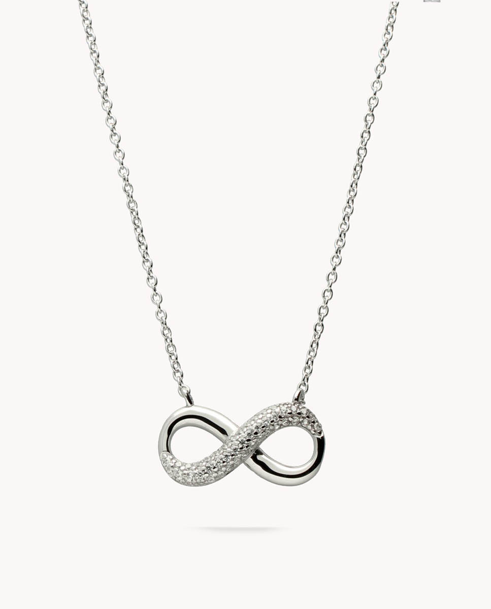 Collar de plata de ley 925 bañada en rodio con infinito de 9 mm x 18 mm (alto por ancho) combinado con circonitas blancas, largo de 40 cms más 4 cms de alargador y cierre de mosquetón.