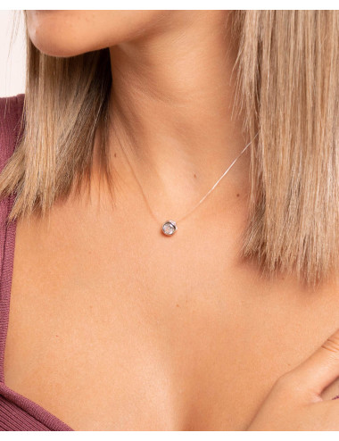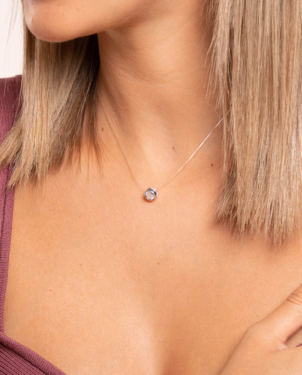 Collar de plata de ley 925 bañada en rodio de tanza invisible con chatón de circonita blanca de 6 mm de diámetro, cierre tipo reasa y largo de 38 cms más 5 cms de alargador.