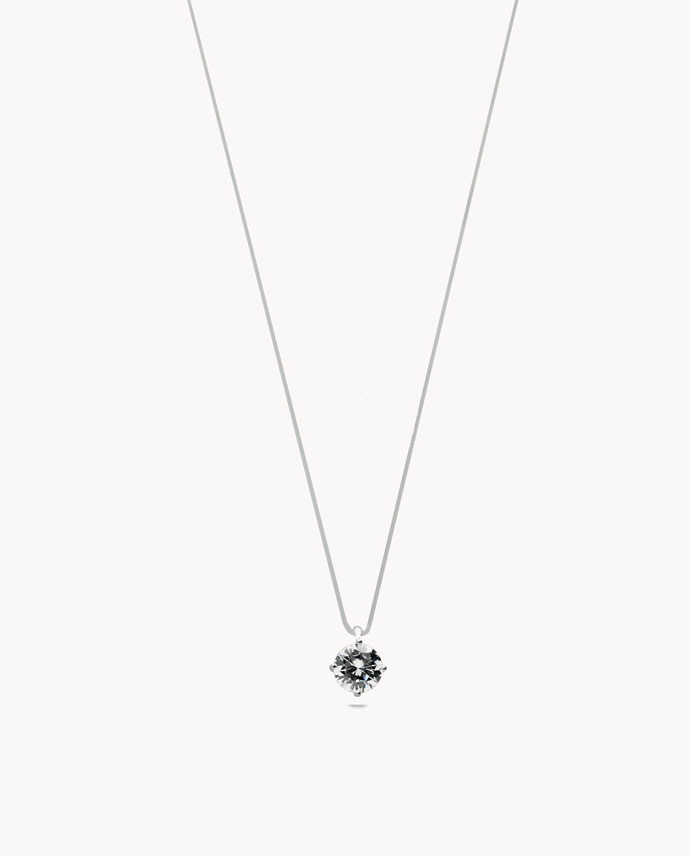 Collar de plata de ley 925 bañada en rodio de tanza invisible con circonita blanca de 6 mm de diámetro engastada en cuatro garras, cierre tipo reasa y largo de 38 cms más 5 cms de alargador.