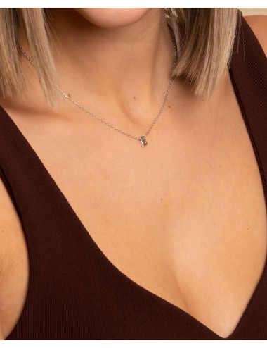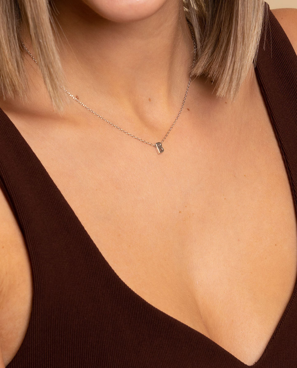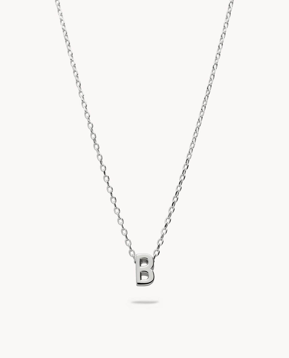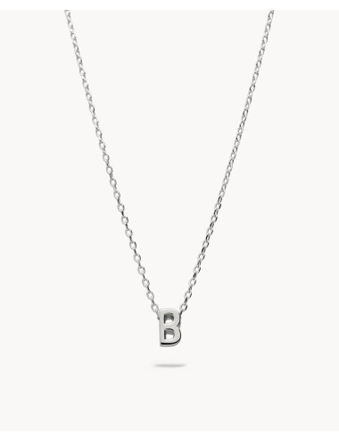 Collar de plata de ley 925 bañada en rodio con inicial B de 7 mm de alto y 3 mm de grosor, cadena de 40 cms más 5 cms de alargador y cierre de mosquetón.