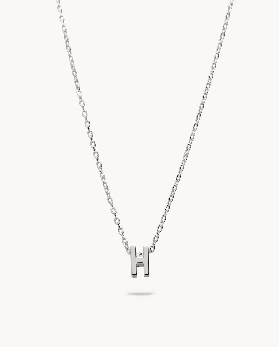 Collar de plata de ley 925 bañada en rodio con inicial H de 7 mm de alto y 3 mm de grosor, cadena de 40 cms más 5 cms de alargador y cierre de mosquetón.