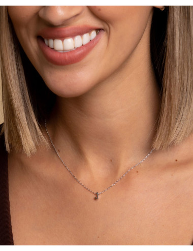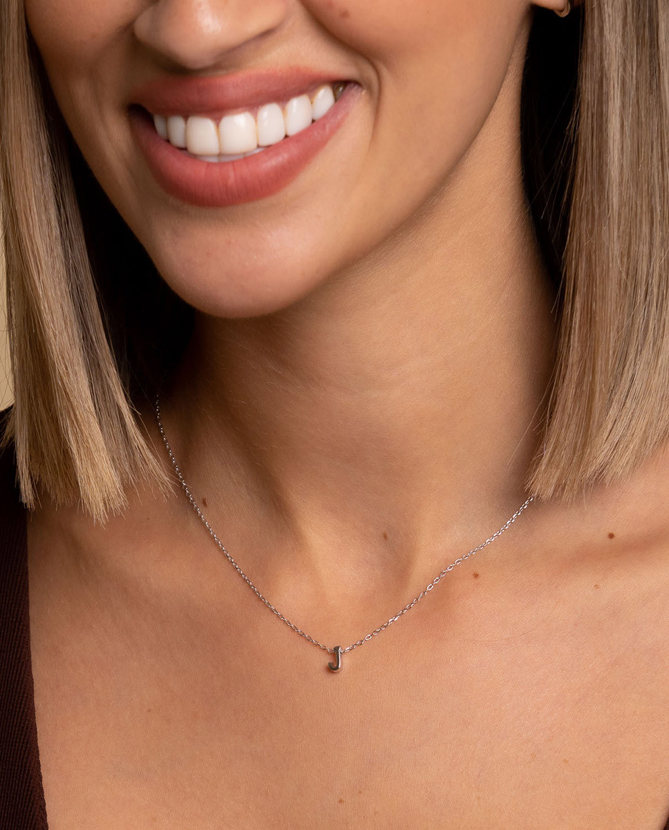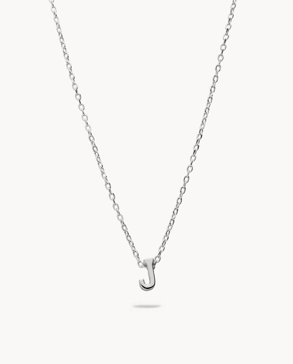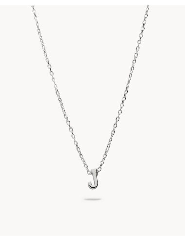 Collar de plata de ley 925 bañada en rodio con inicial J de 7 mm de alto y 3 mm de grosor, cadena de 40 cms más 5 cms de alargador y cierre de mosquetón.