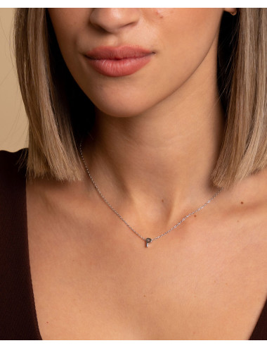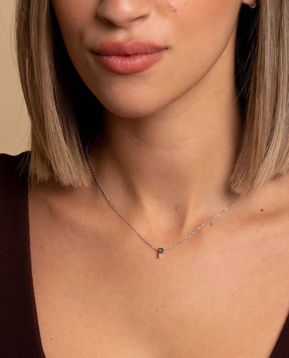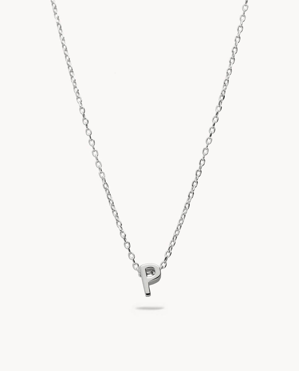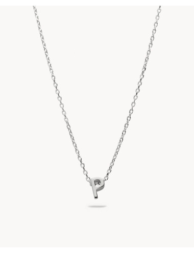 Collar de plata de ley 925 bañada en rodio con inicial P de 7 mm de alto y 3 mm de grosor, cadena de 40 cms más 5 cms de alargador y cierre de mosquetón.