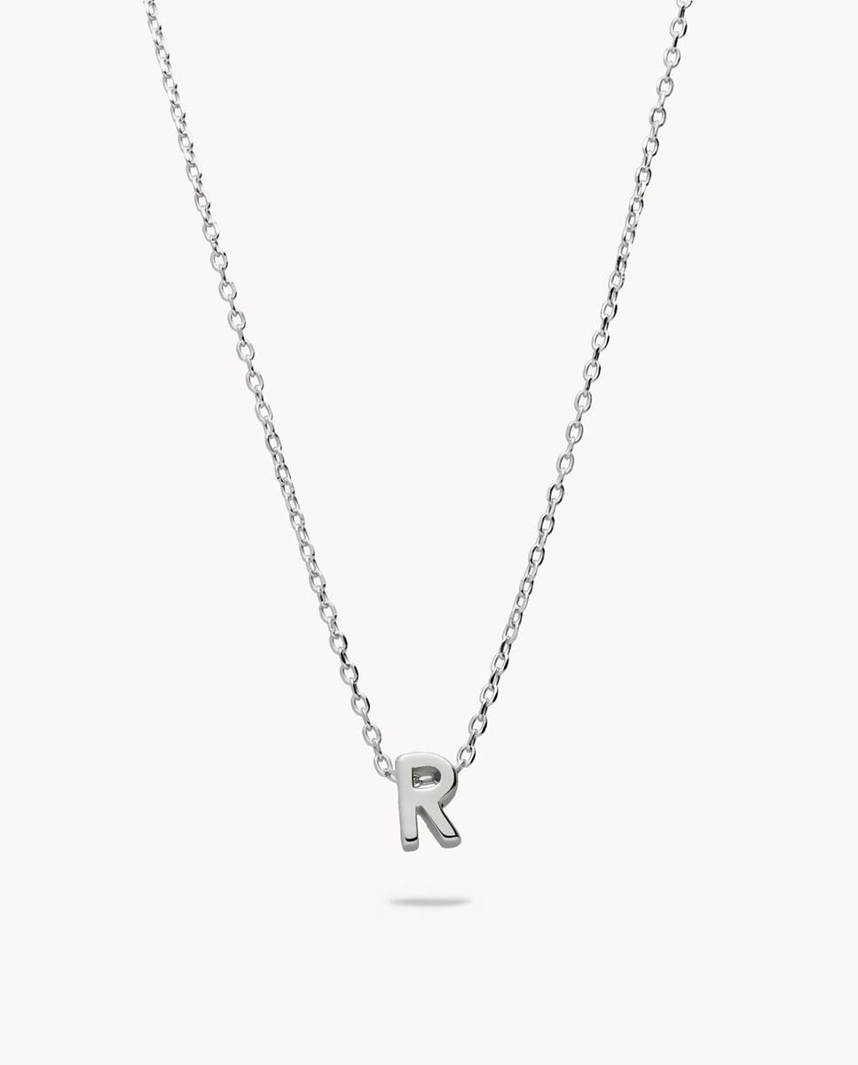 Collar de plata de ley 925 bañada en rodio con inicial R de 7 mm de alto y 3 mm de grosor, cadena de 40 cms más 5 cms de alargador y cierre de mosquetón.
