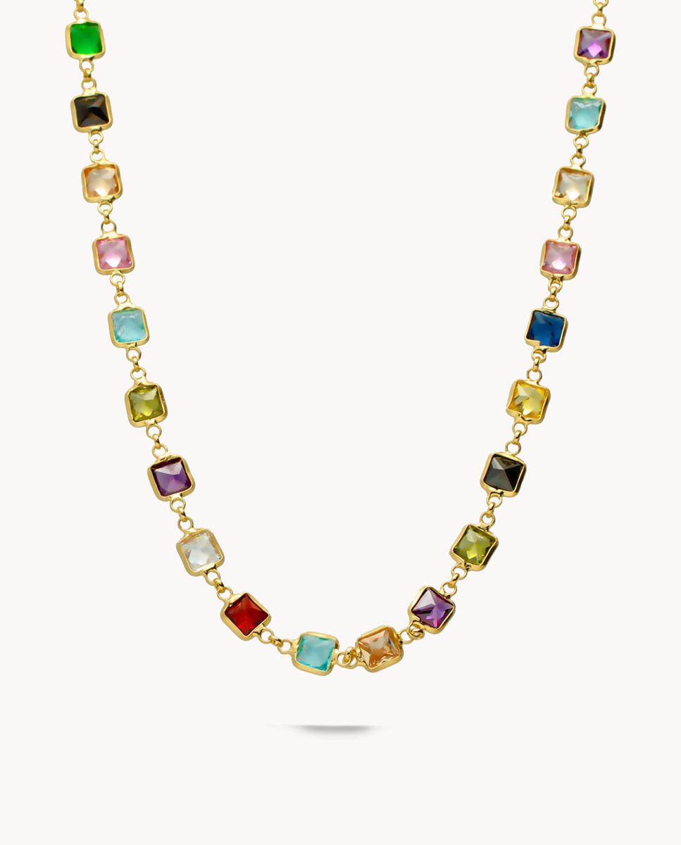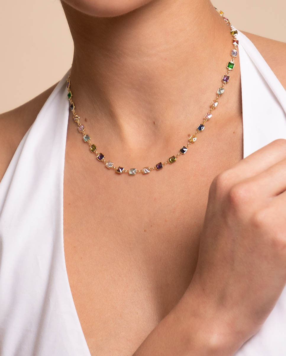 Collar de plata de ley 925 bañada en oro 18k con circonitas multicolor, largo de 40 cms más 5 cms de alargador y cierre de mosquetón.
