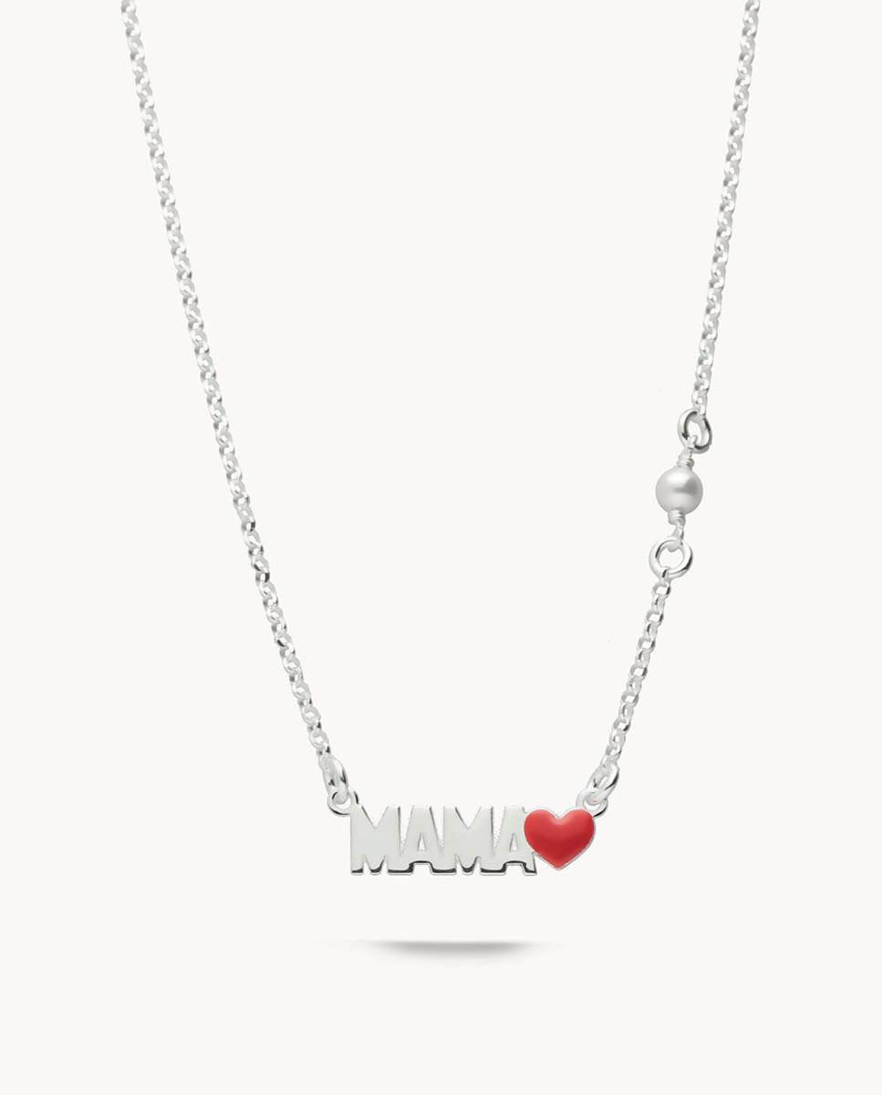 Collar de plata de ley 925 con motivo central Mamá y corazón lateral esmaltado en rojo, detalle de perla cultivada de 4 mm de diámetro, largo de 40 cms más 5 cms de alargador y cierre de mosquetón.