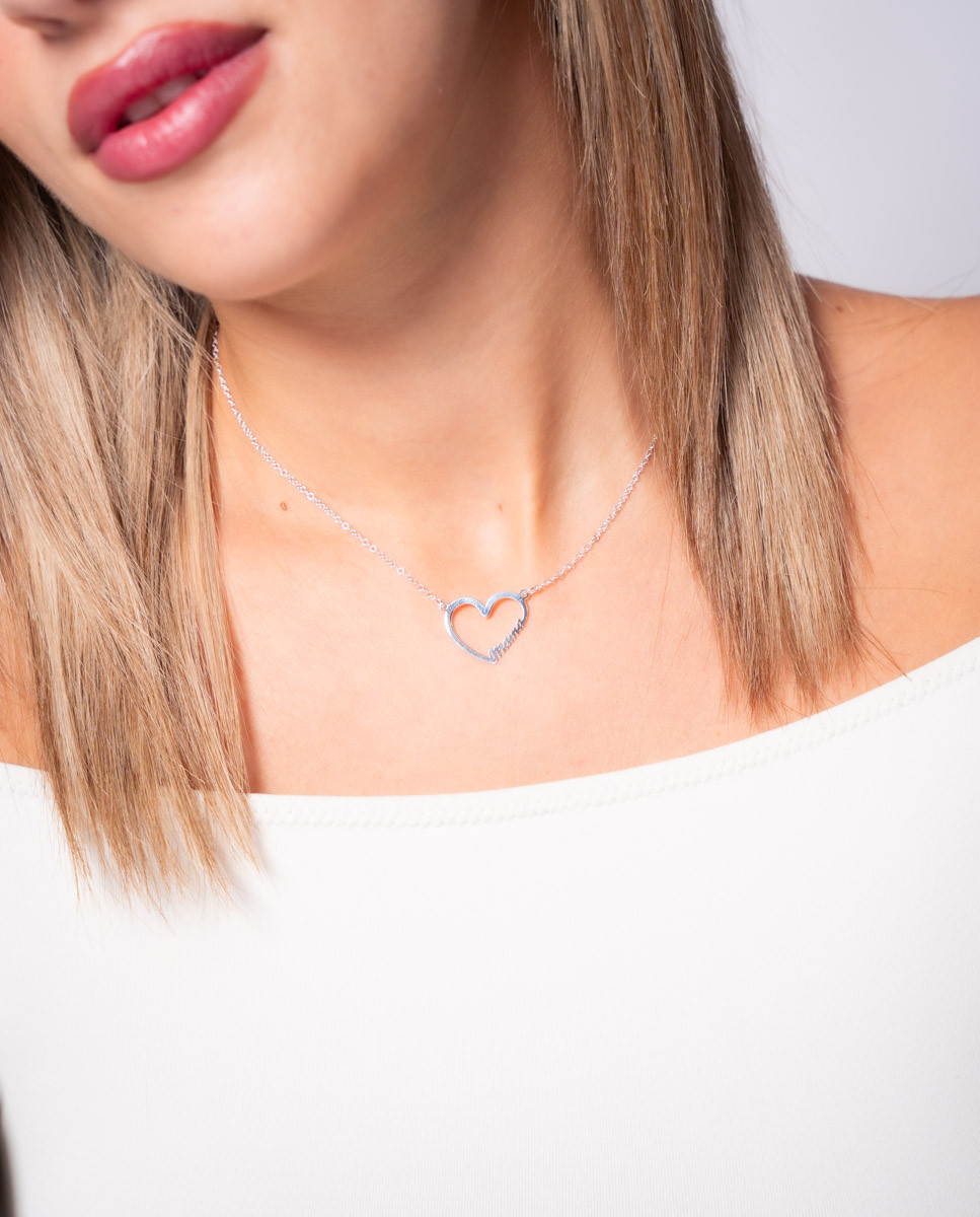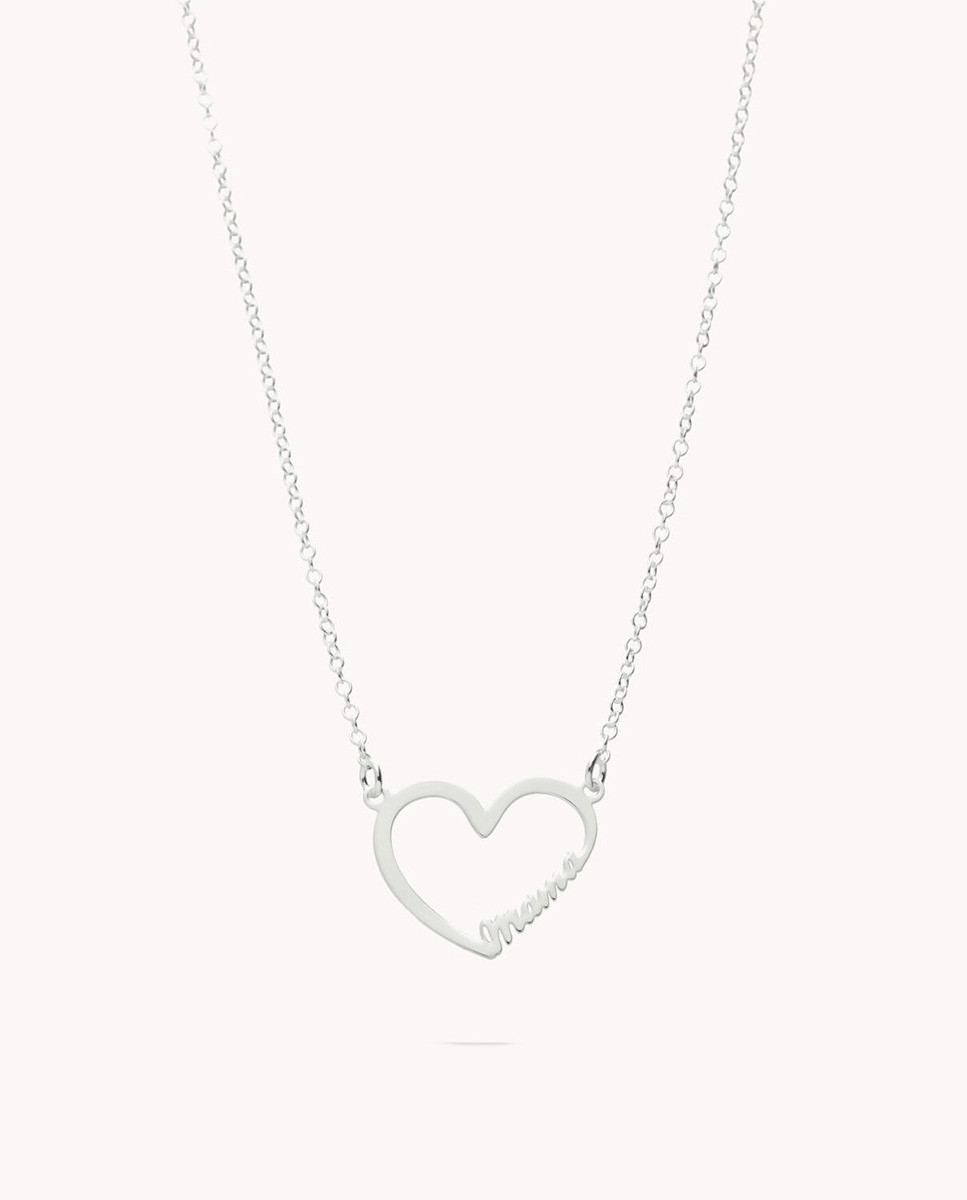 Collar de plata de ley 925 con corazón de 15 mm de diámetro y motivo Mamá escrito en su lateral, largo de 42 cms más 3 cms de alargador y cierre de mosquetón.