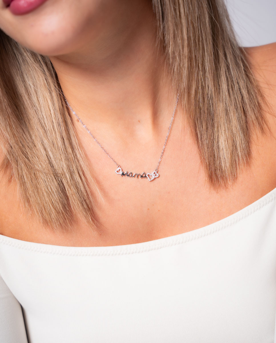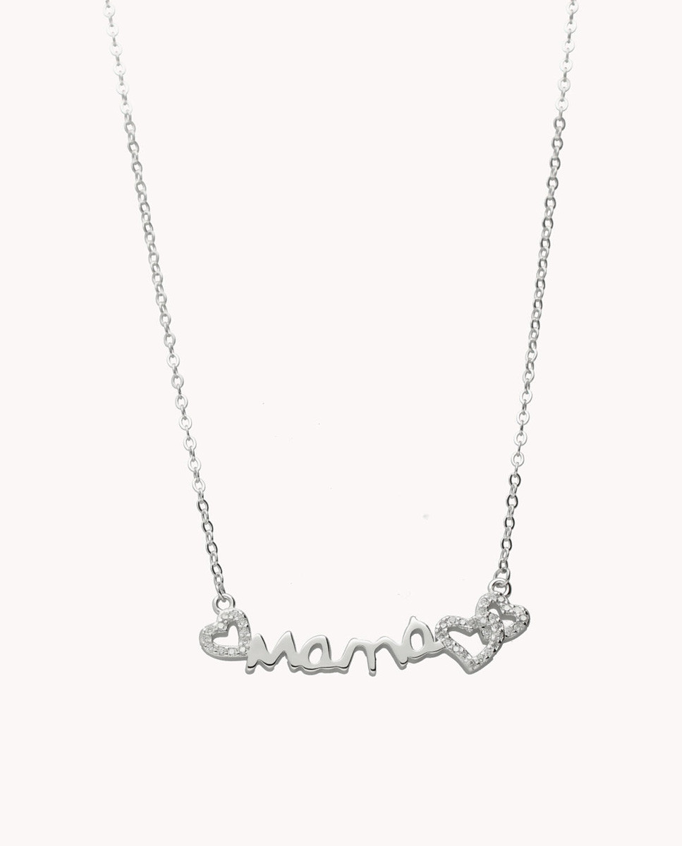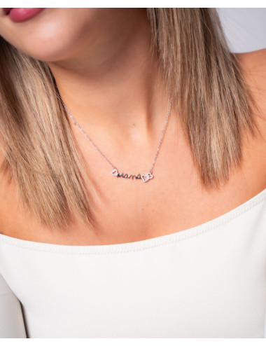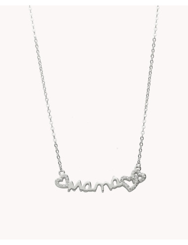 Collar de plata de ley 925 bañada en rodio con motivo central mamá y detalle en ambos extremos de corazones con circonitas blancas, largo de 42 cms más 2,5 cms de alargador y cierre de mosquetón.