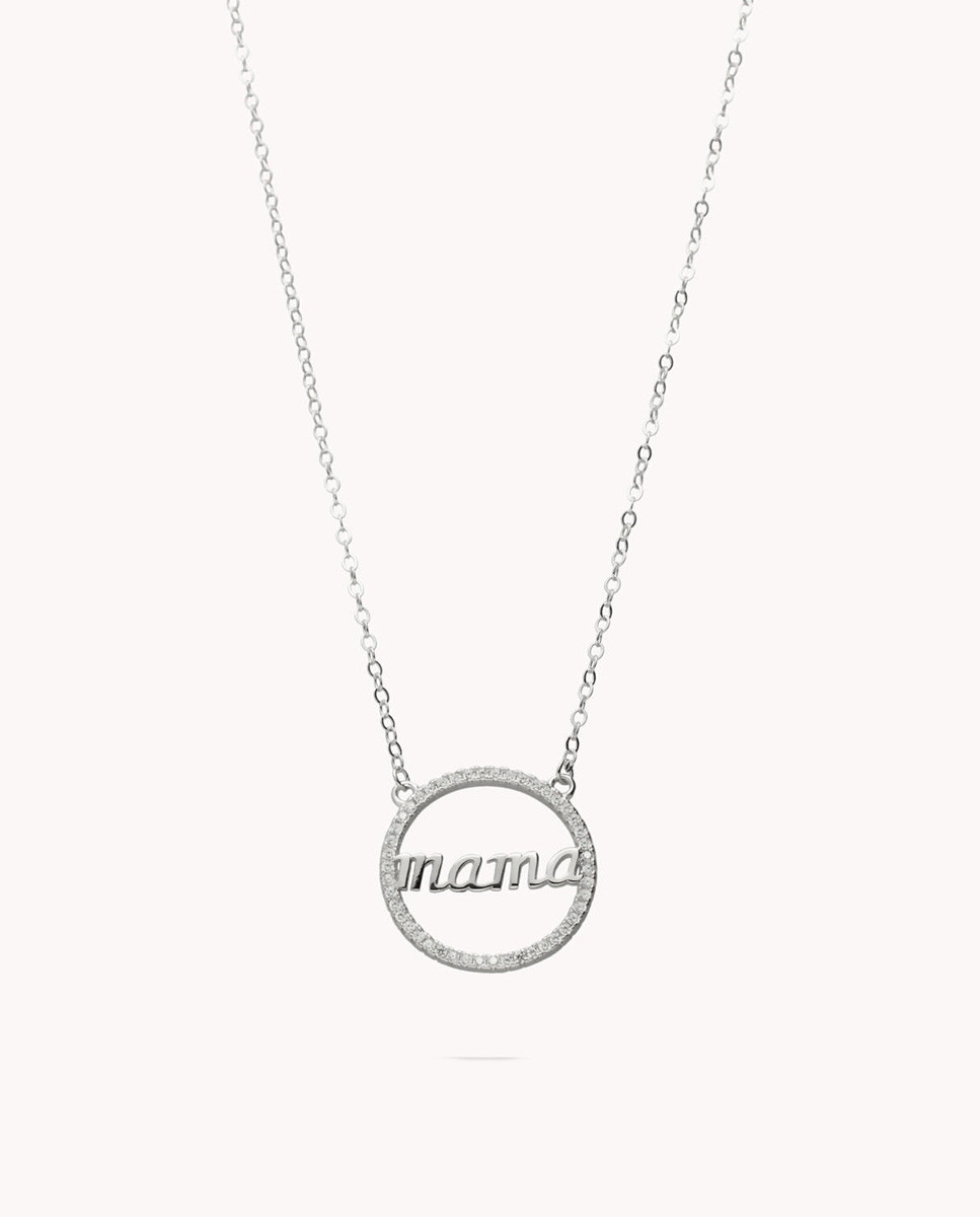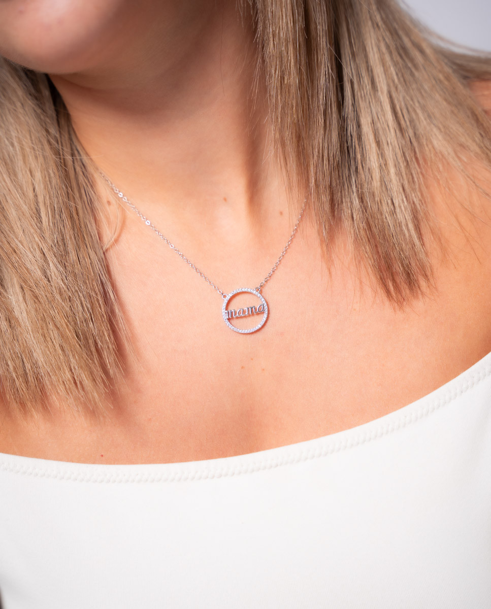 Collar de plata de ley 925 bañada en rodio con círculo de circonitas blancas y motivo Mamá escrito en su interior, largo de 42,5 cms más 3 cms de alargador y cierre tipo reasa.