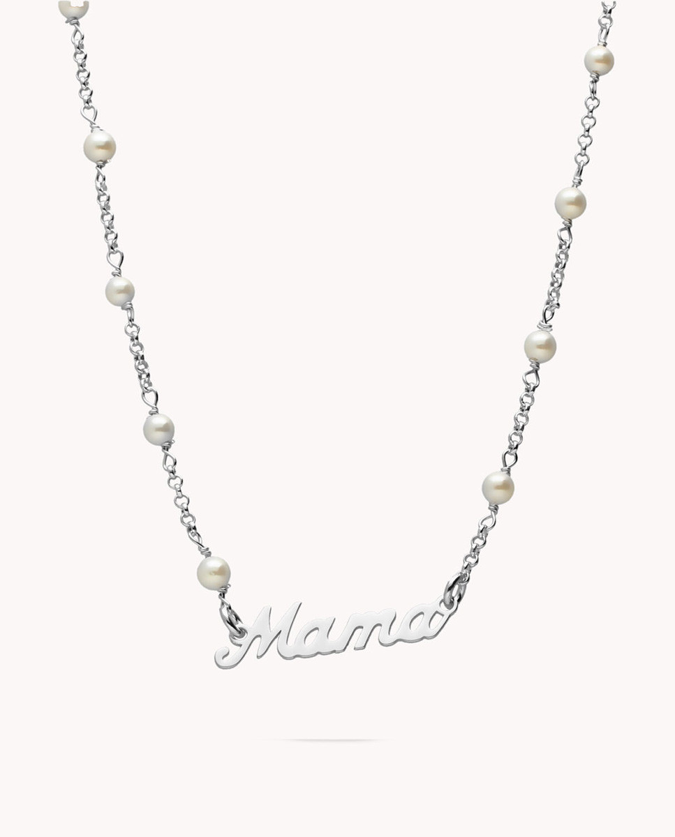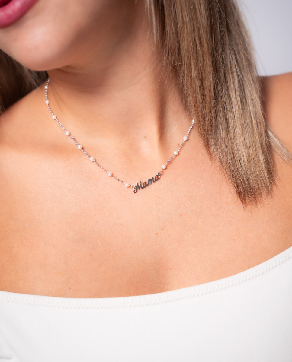 Collar de plata de ley 925 bañada en rodio con perlas cultivadas de 3 mm de diámetro y motivo central Mamá , largo de 40 cms más 5 cms de alargador y cierre de mosquetón.