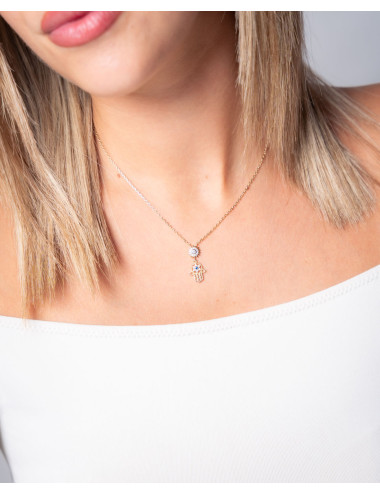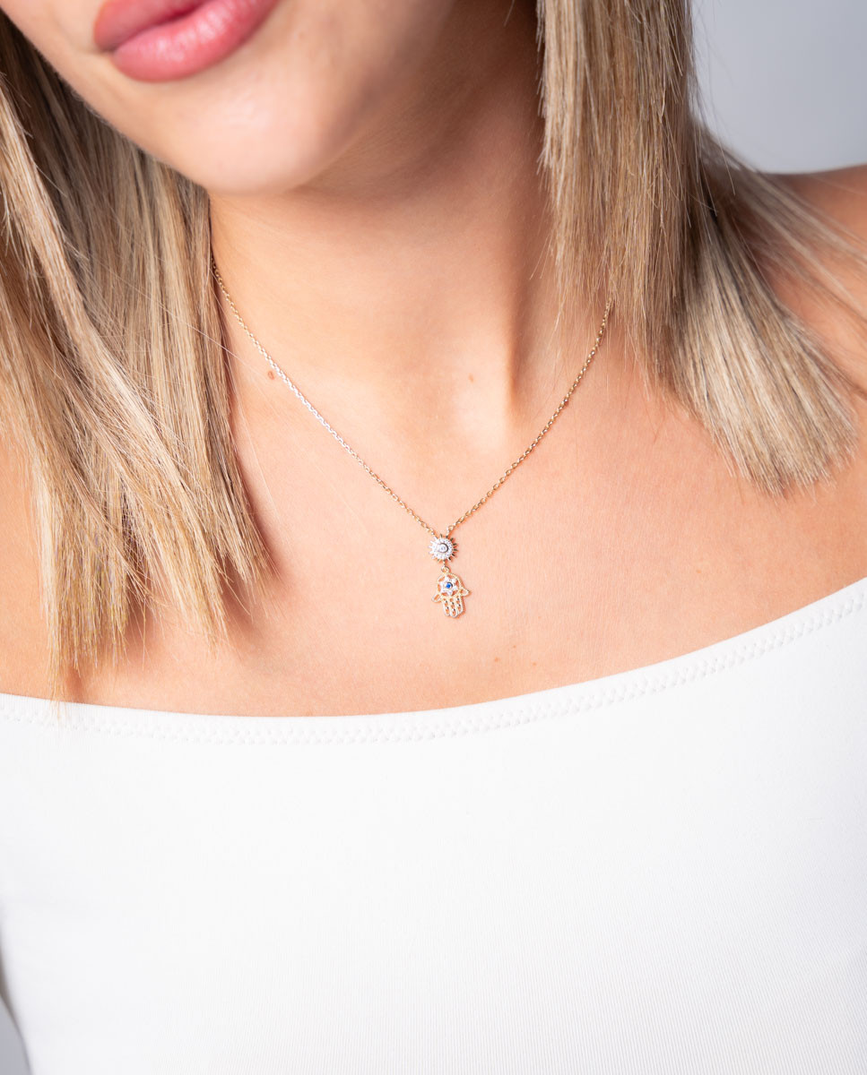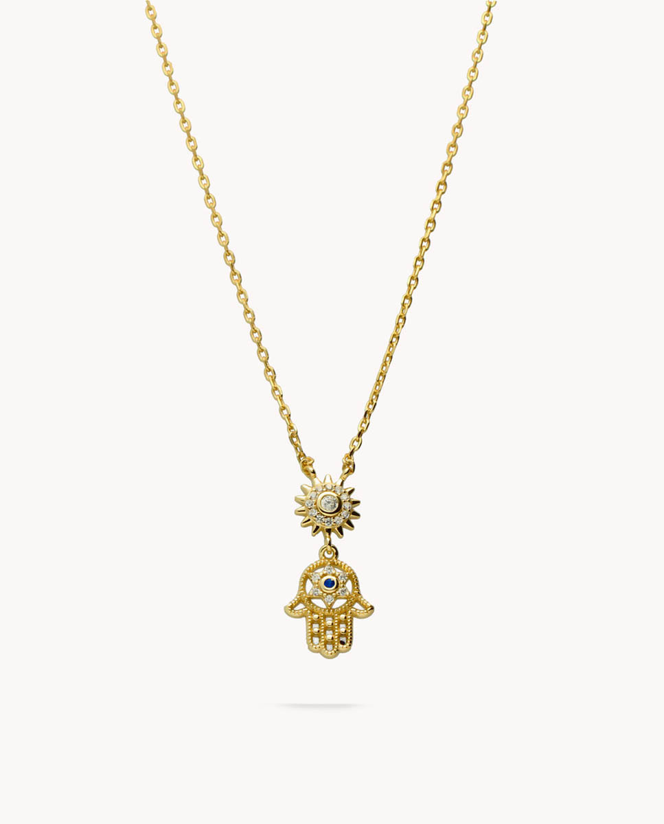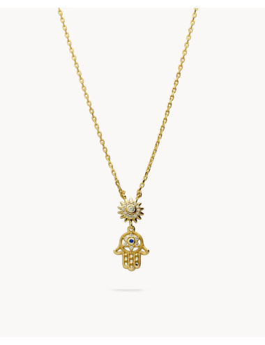 Collar mano de fátima y sol de plata de ley 925 bañada en oro