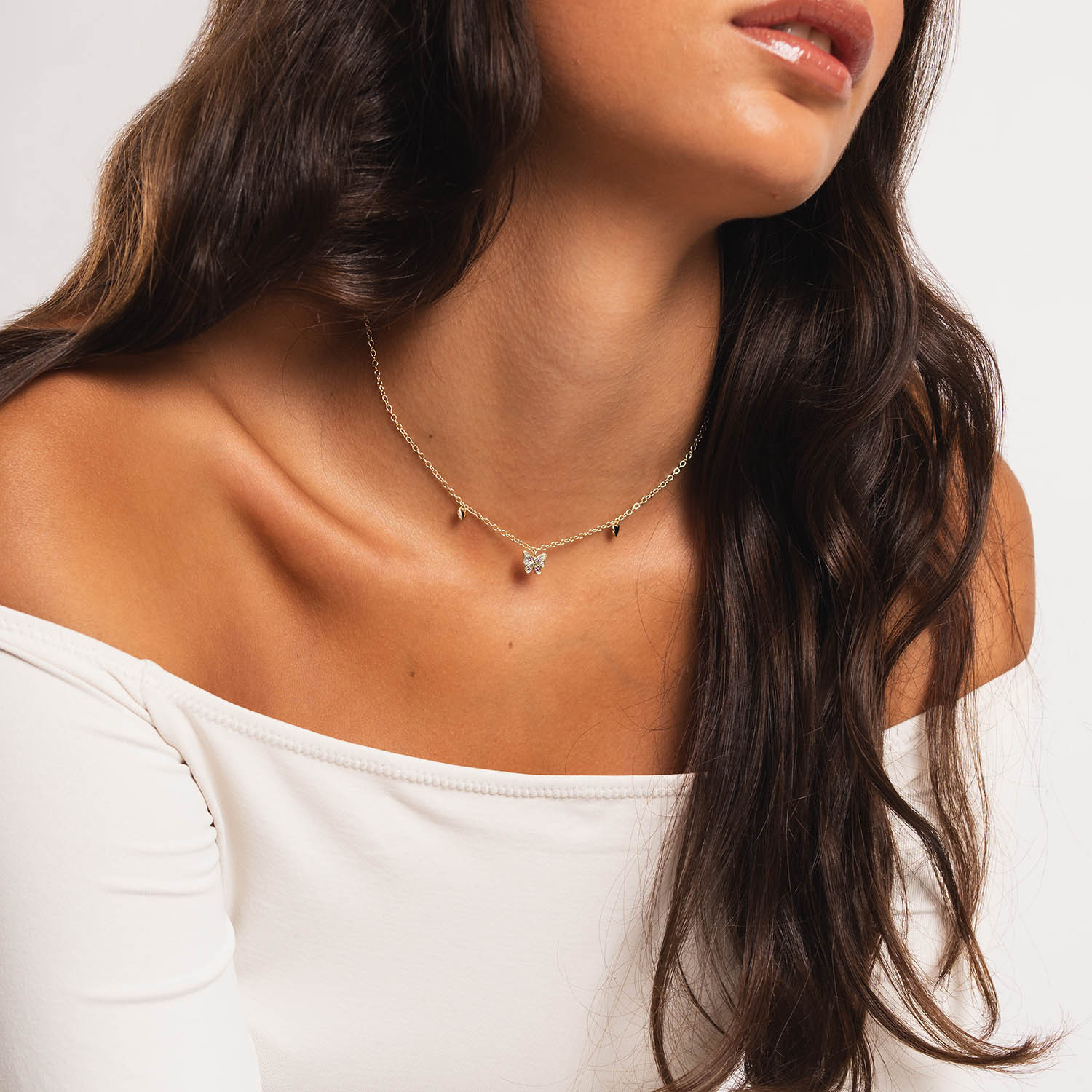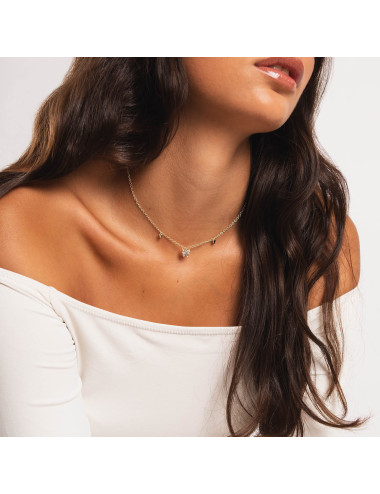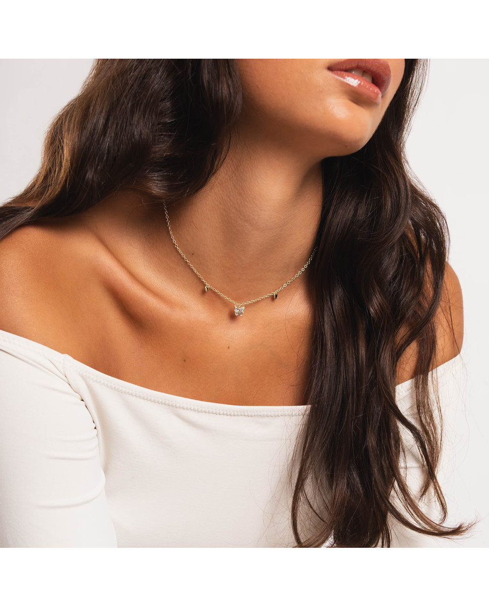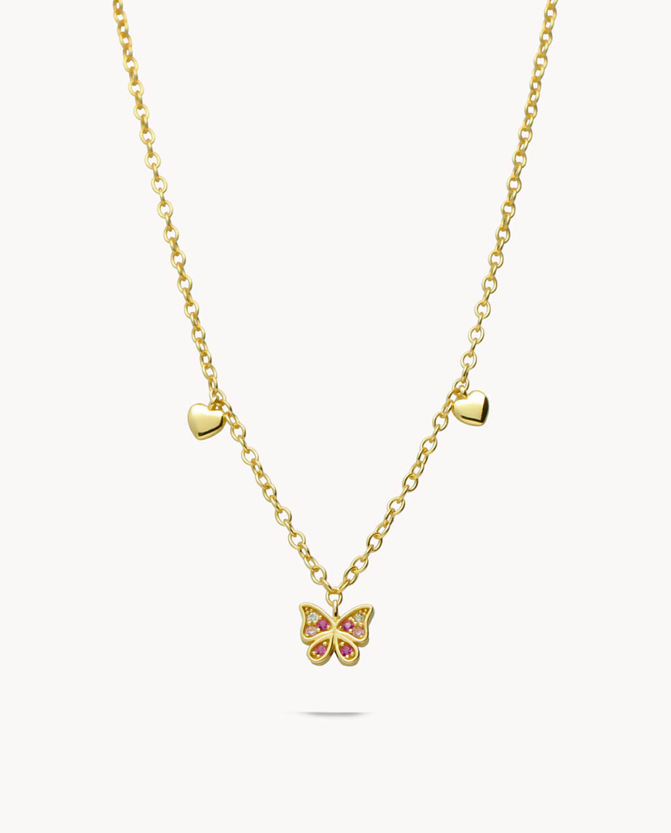 Collar de plata de ley 925 bañada en oro 18K con colgante central de mariposa con circonitas blancas y rosas en su interior de 8 mm x 7 mm (ancho por alto) y corazones lisos en los laterales, largo de 40 cms más 5,5 cms de alargador y cierre de mosquetón.