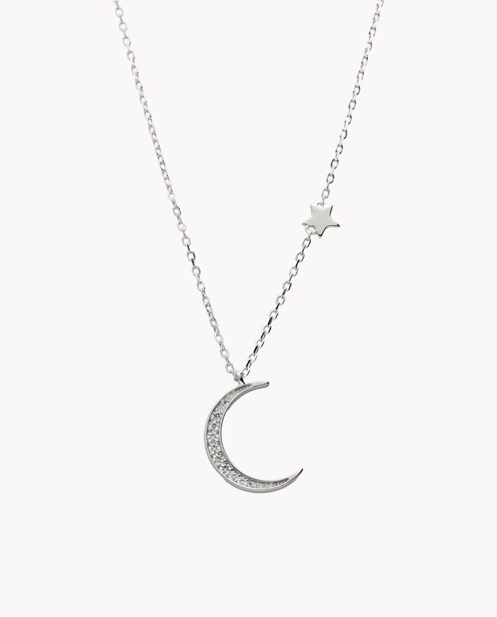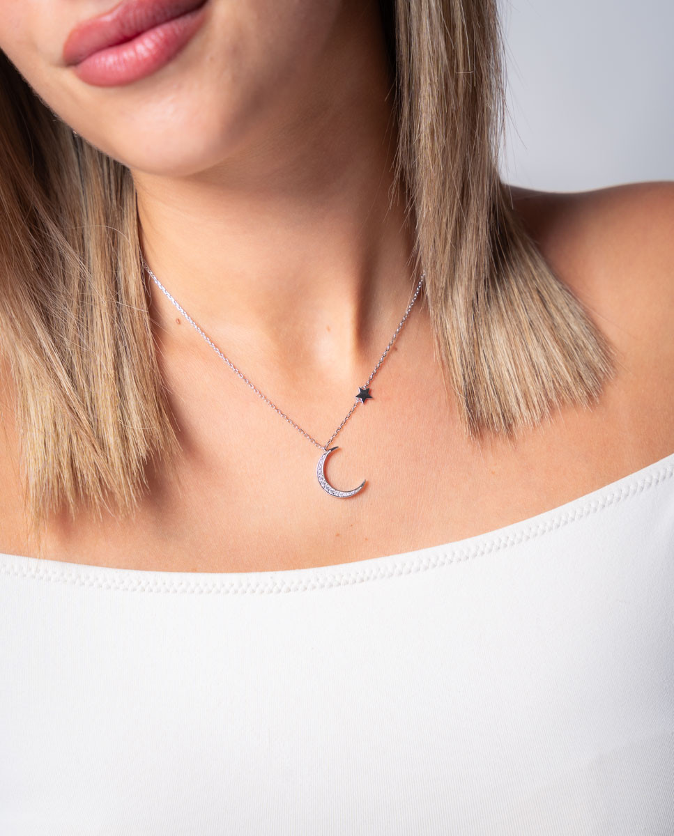 Collar de plata de ley 925 bañada en rodio con colgante de luna de 18 mm de alto y circonitas blancas en su interior con detalle lateral de estrella, largo de 41 cms más 5 cms de alargador y cierre de mosquetón.
