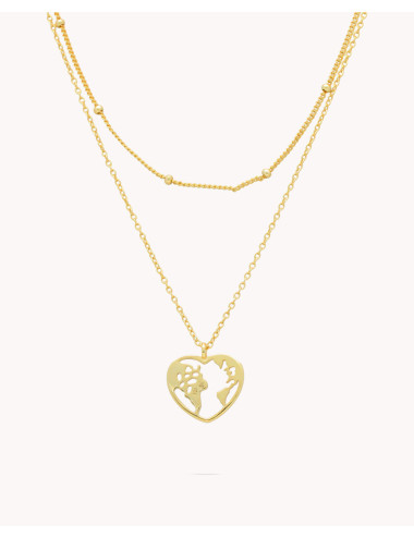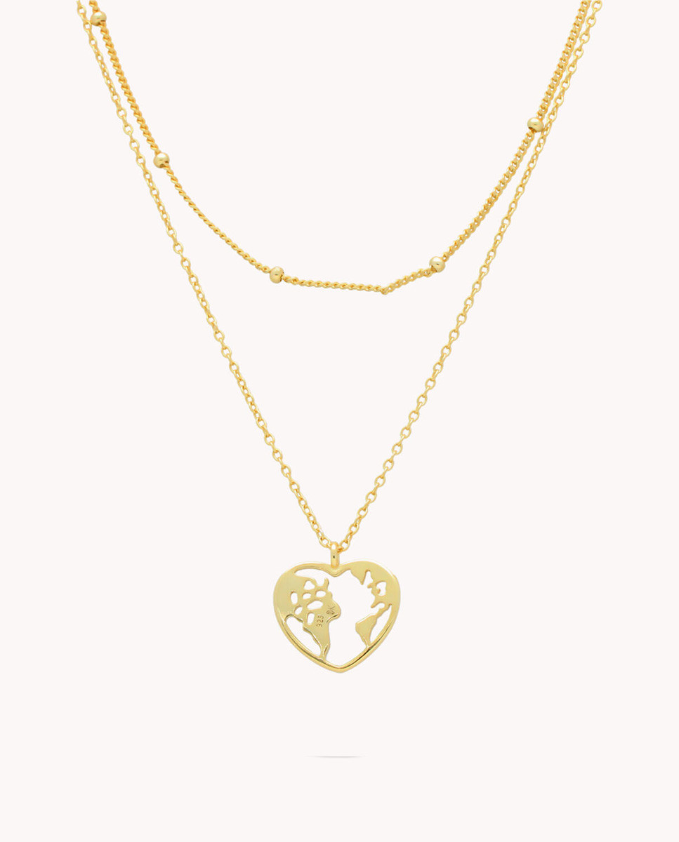 Collar mundo corazón en doble cadena de plata de ley 925 bañada en oro