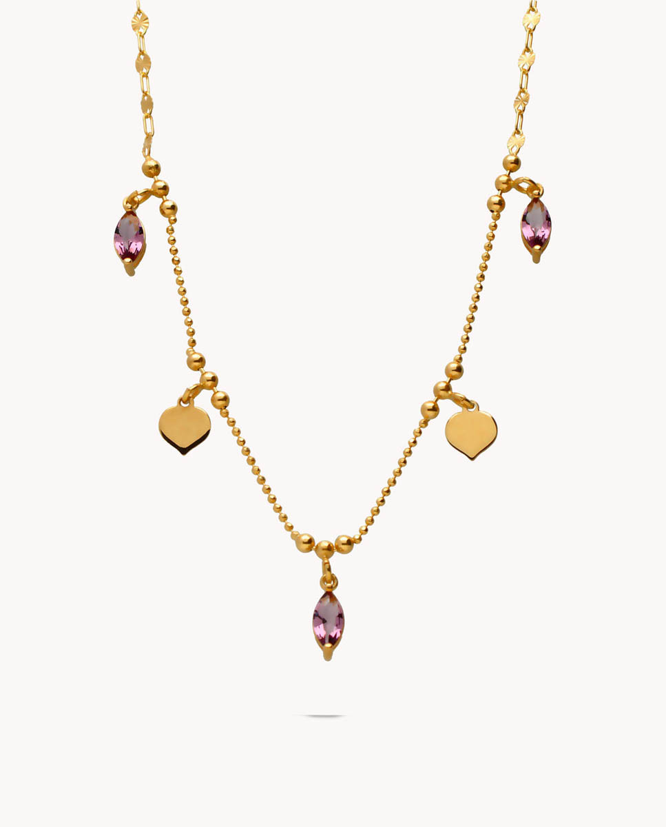 Collar de plata de ley 925 bañada en oro 18K con colgantes de corazón de 7 mm x 7 mm (ancho por alto) y circonitas color amatista de 4 mm x 7 mm (ancho por alto), largo de 40 cms más 5 cms de alargador y cierre de mosquetón.