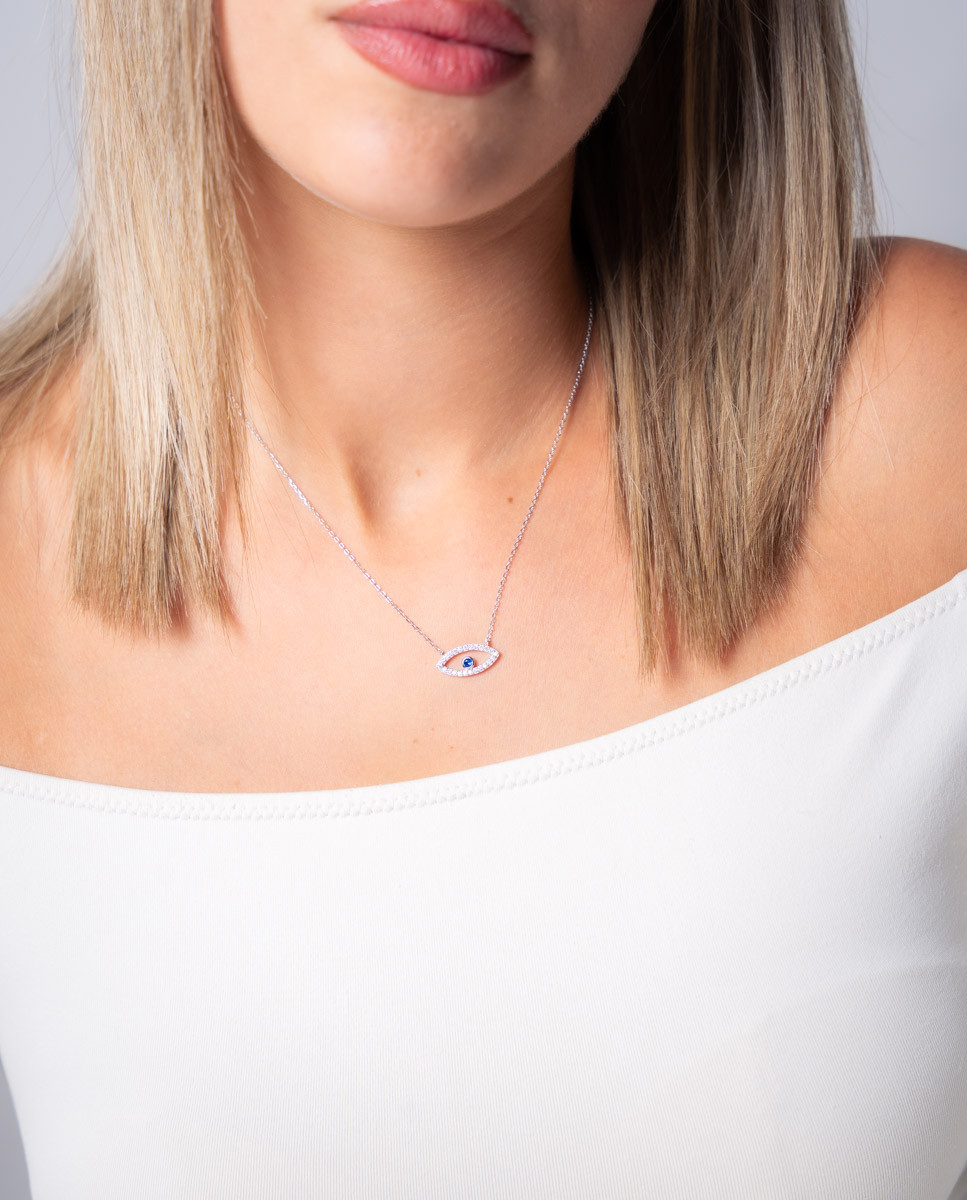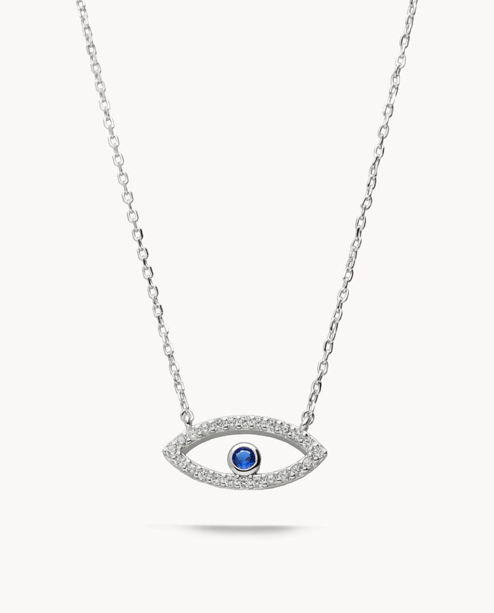 Collar de plata de ley 925 bañada en rodio de ojo turco con circonitas blancas y una circonita azul central, cierre de mosquetón y 41 cms de largo más 5 cms de alargador.