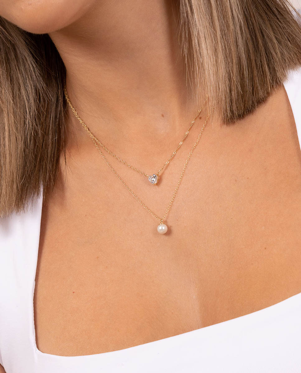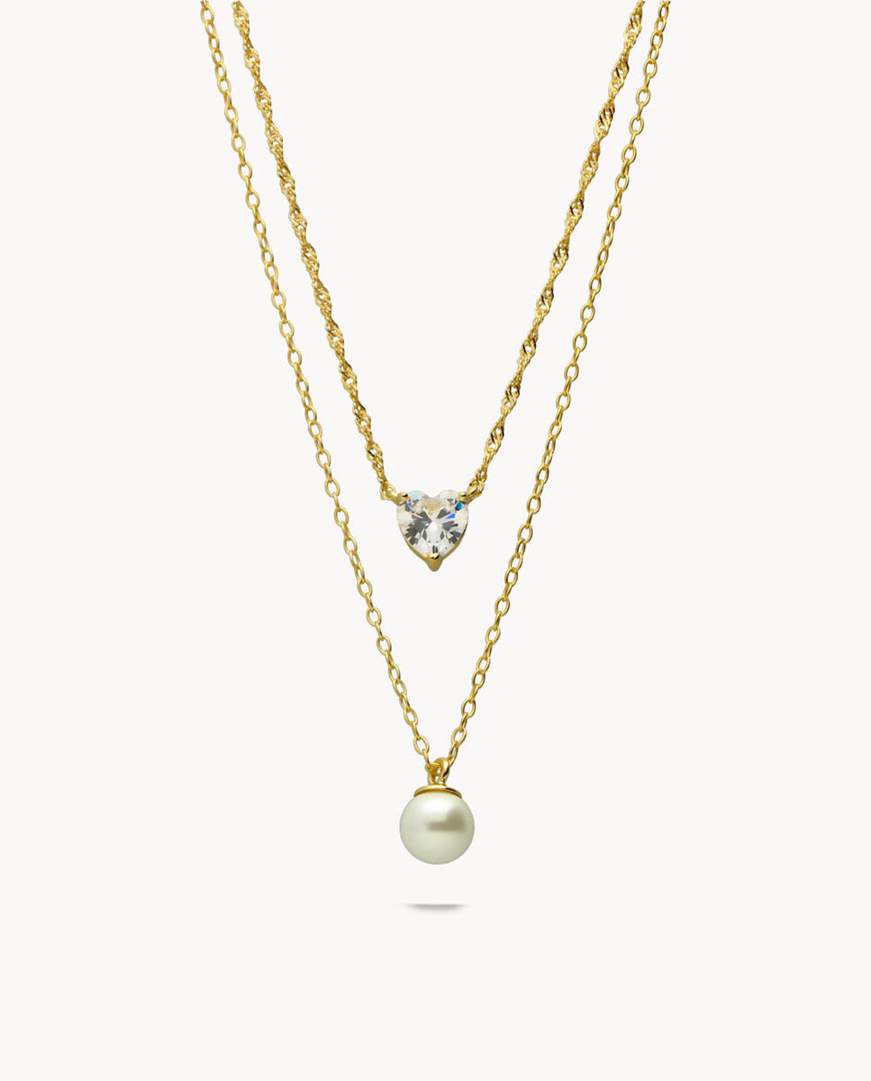 Collar de plata de ley 925 bañada en oro 18K, consta de dos cadenas, una de ellas con corazón central de circonita blanca de 6 mm x 6 mm (ancho por alto), la otra cadena con colgante de perla cultivada de 6 mm de diámetro, cierre de mosquetón y largo de 40,5 cms más 5 cms de alargador.