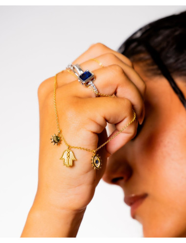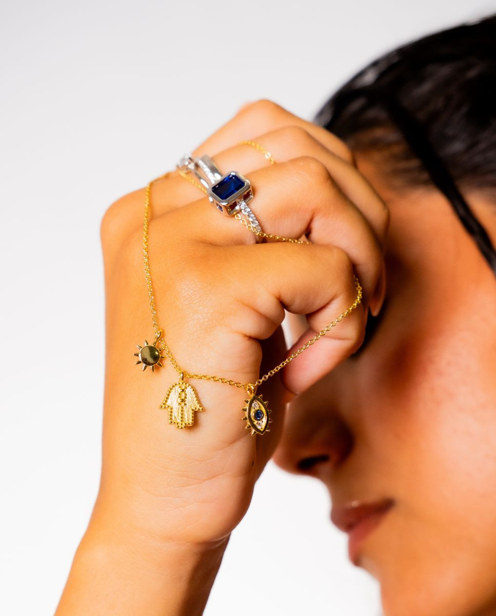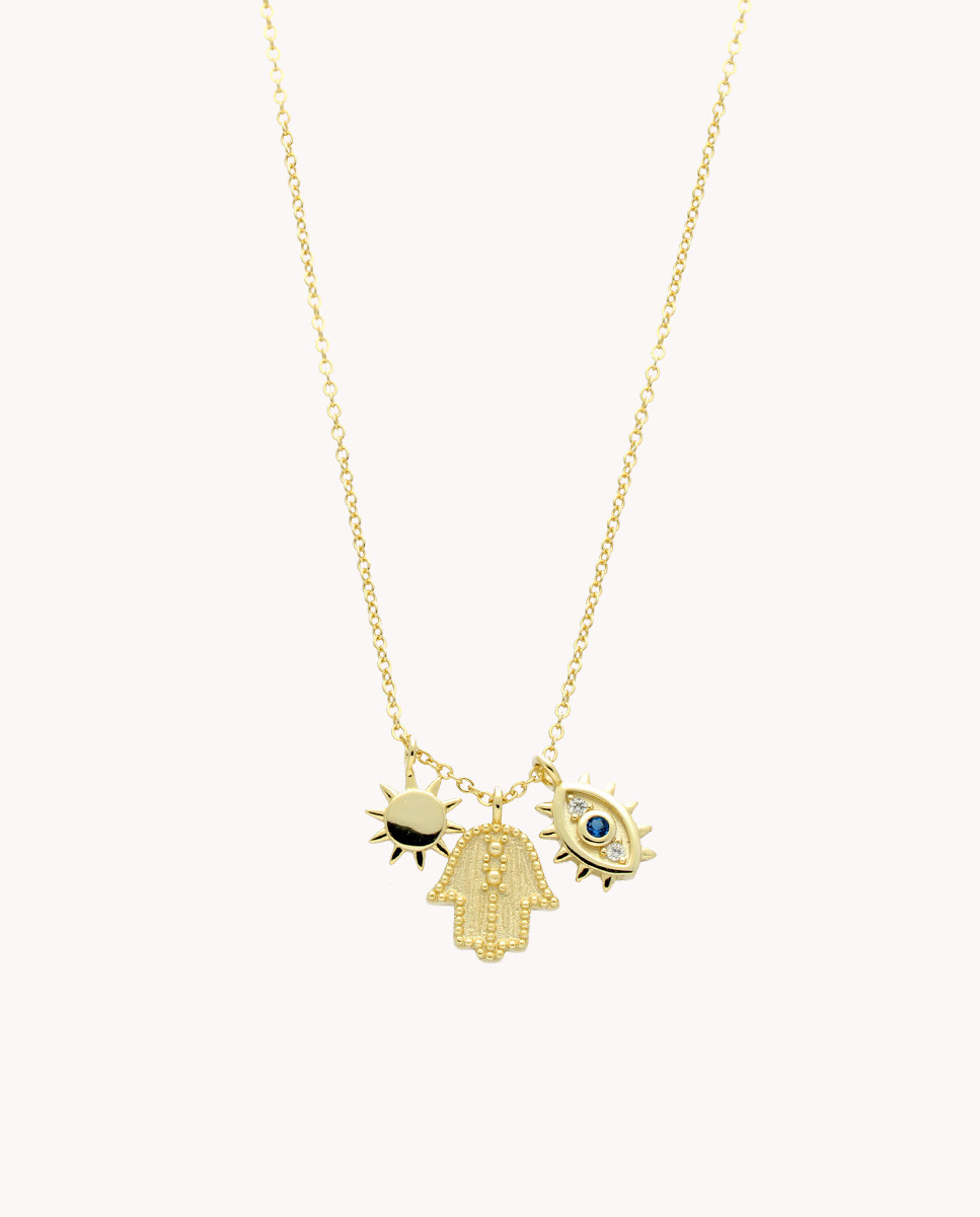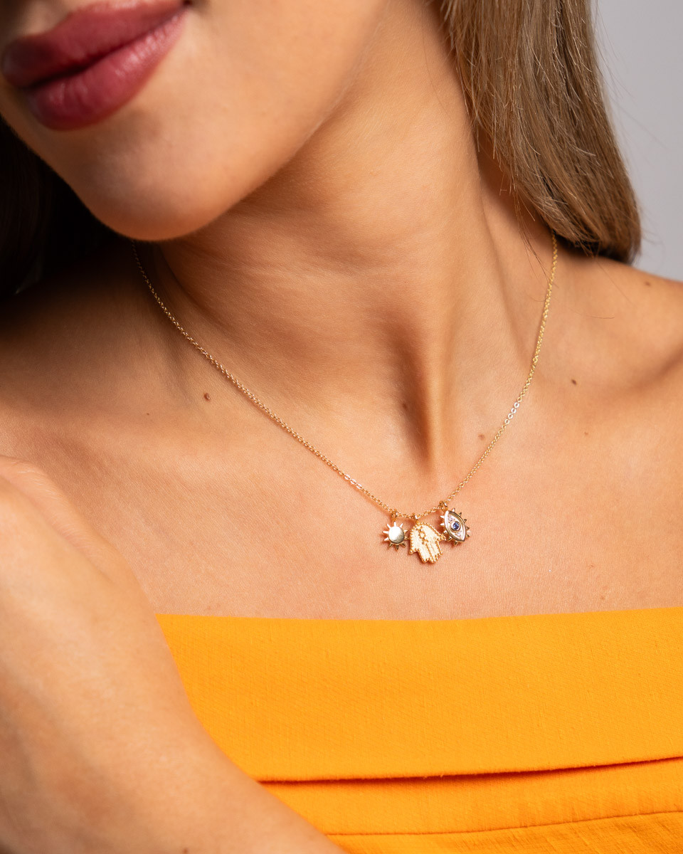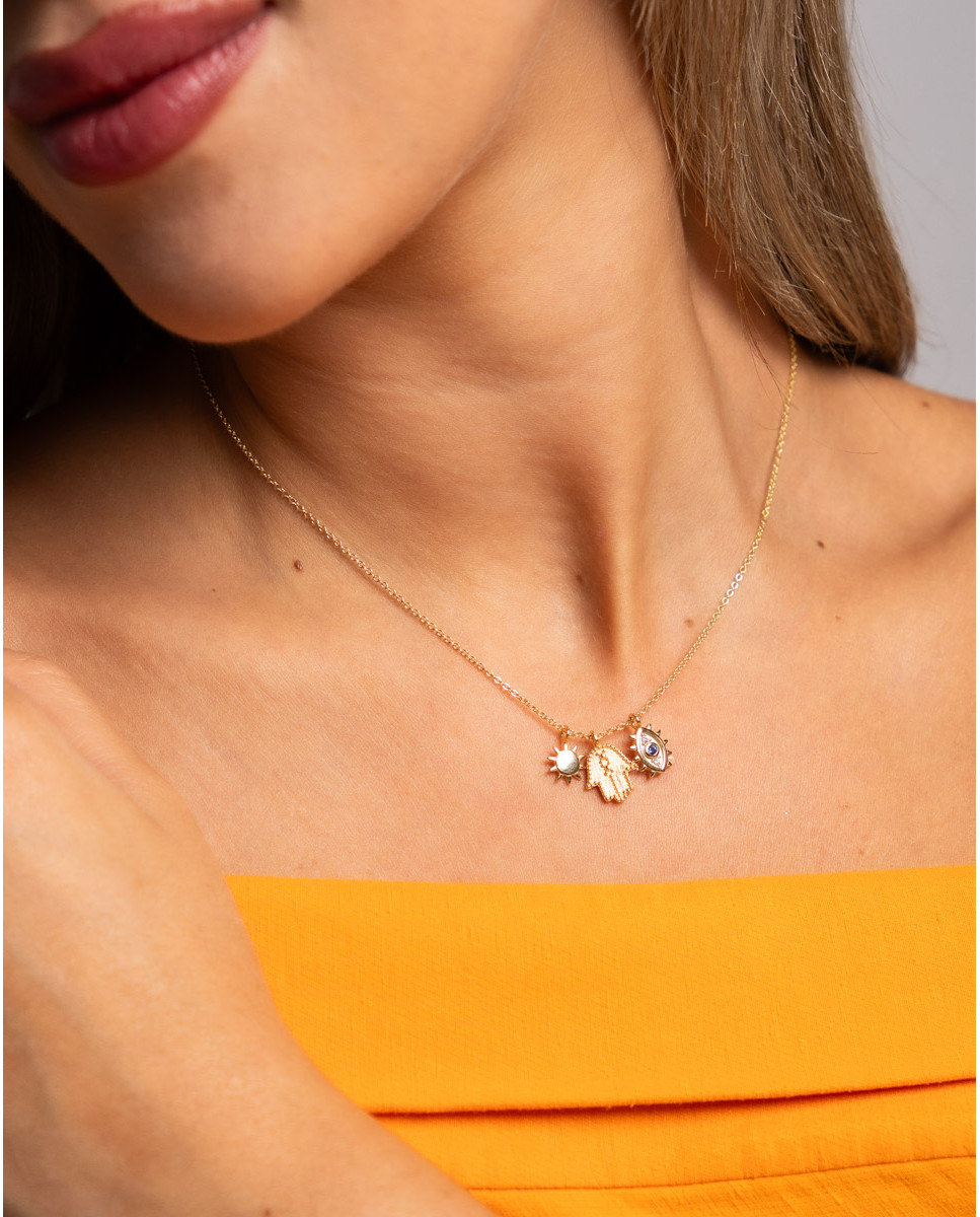 Collar de plata de ley 925 bañada en oro 18K con colgante de sol de 6 mm, mano de Fátima de 11 mm y ojo turco de 10 x 5 mm ( alto x ancho) , largo de 42 cms más 3 cms de extensión con detalle de circonita blanca de 3 mm y cierre de mosquetón.