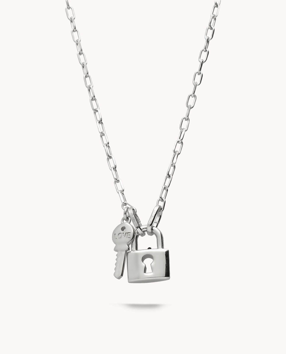 Collar de plata de ley 925 bañada en rodio con candado de 10 mm x 13 mm (ancho por alto) y llave de 6 mm x 13 mm (ancho por alto), largo de 40 cms más 5 cms de alargador y cierre de mosquetón.
