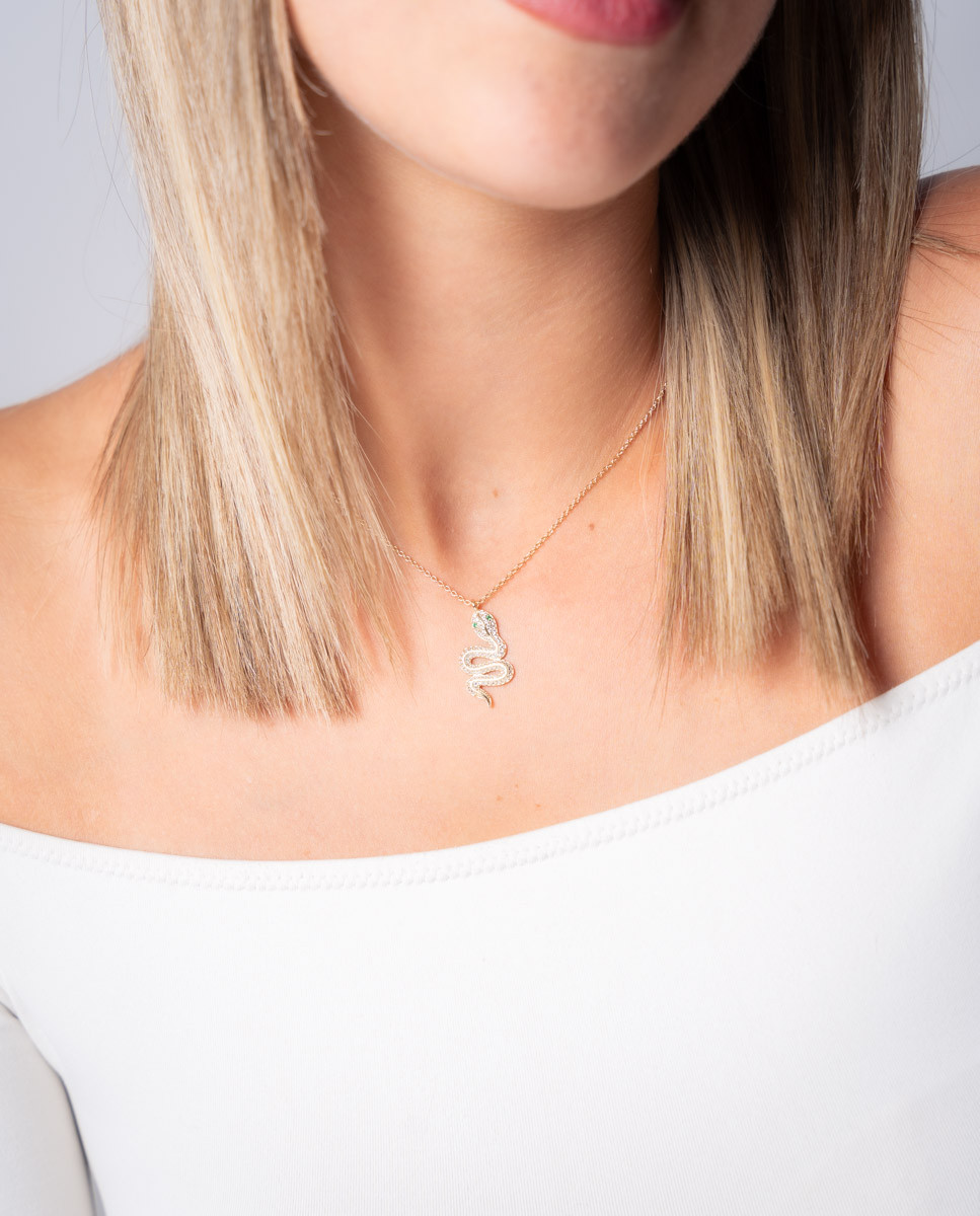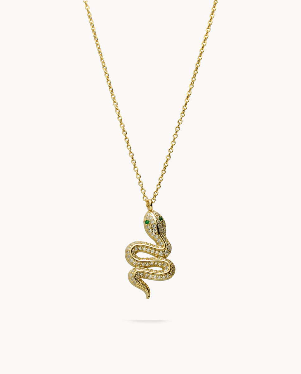 Collar de plata de ley 925 bañada en oro con serpiente de 12 mm x 23 mm (ancho por alto), circonitas blancas en su interior y ojos con circonitas verdes. Cadena con cierre de mosquetón y largo de 40 cms más 5 cms de alargador.