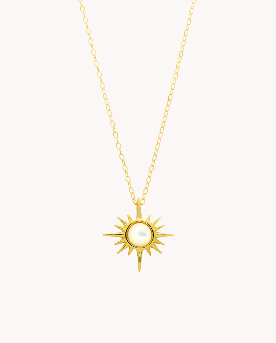 Collar de plata de ley 925 bañada en oro 18k con colgante de sol de 15 mm de diámetro y piedra central de nácar blanco, largo de 40 cms más 5 cms de alargador y cierre de mosquetón.
