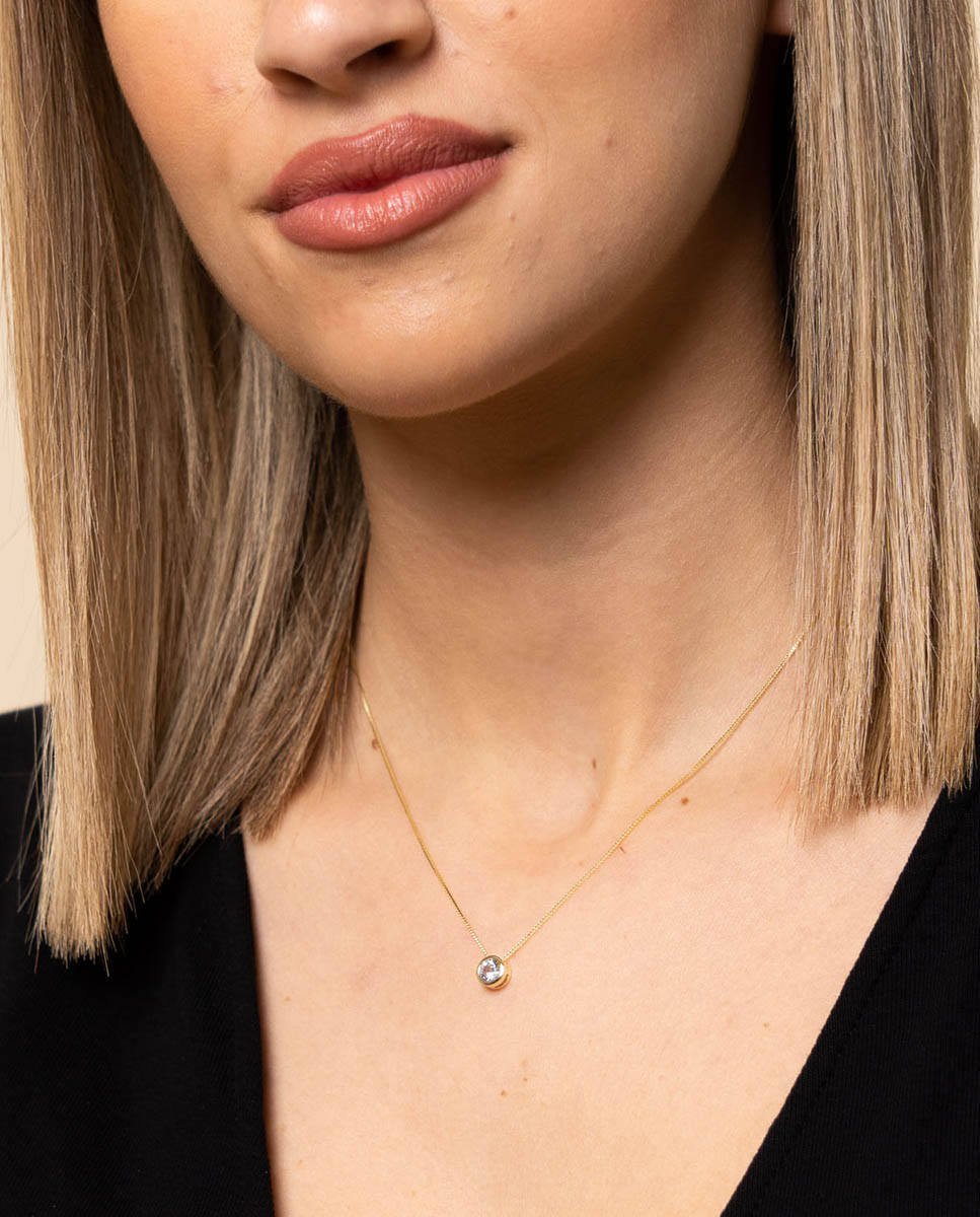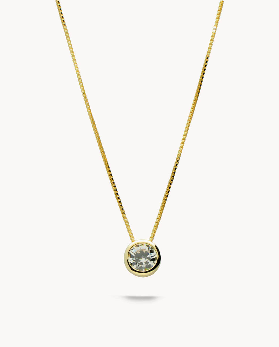 Collar de plata de ley 925 bañada en oro 18K con chatón de circonita blanca de 6 mm de diámetro, cierre tipo reasa y largo de 38 cms más 4 cms de alargador.