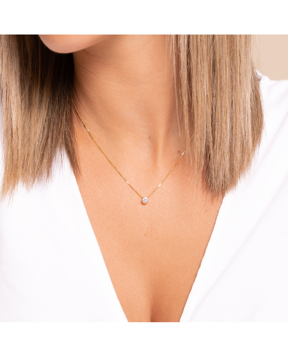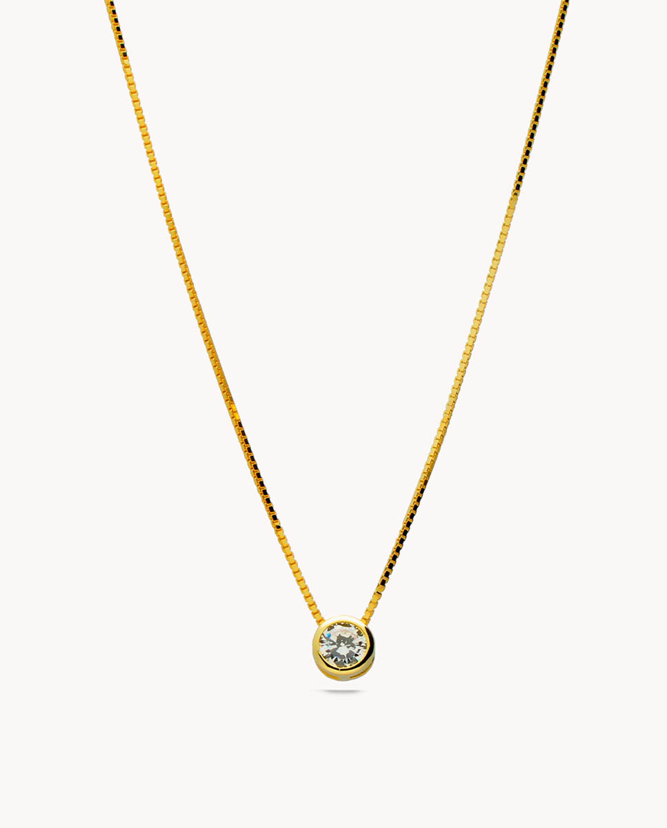 Collar de plata de ley 925 bañada en oro 18K con chatón de circonita blanca de 5 mm de diámetro, cierre tipo reasa y largo de 40 cms más 5 cms de alargador.