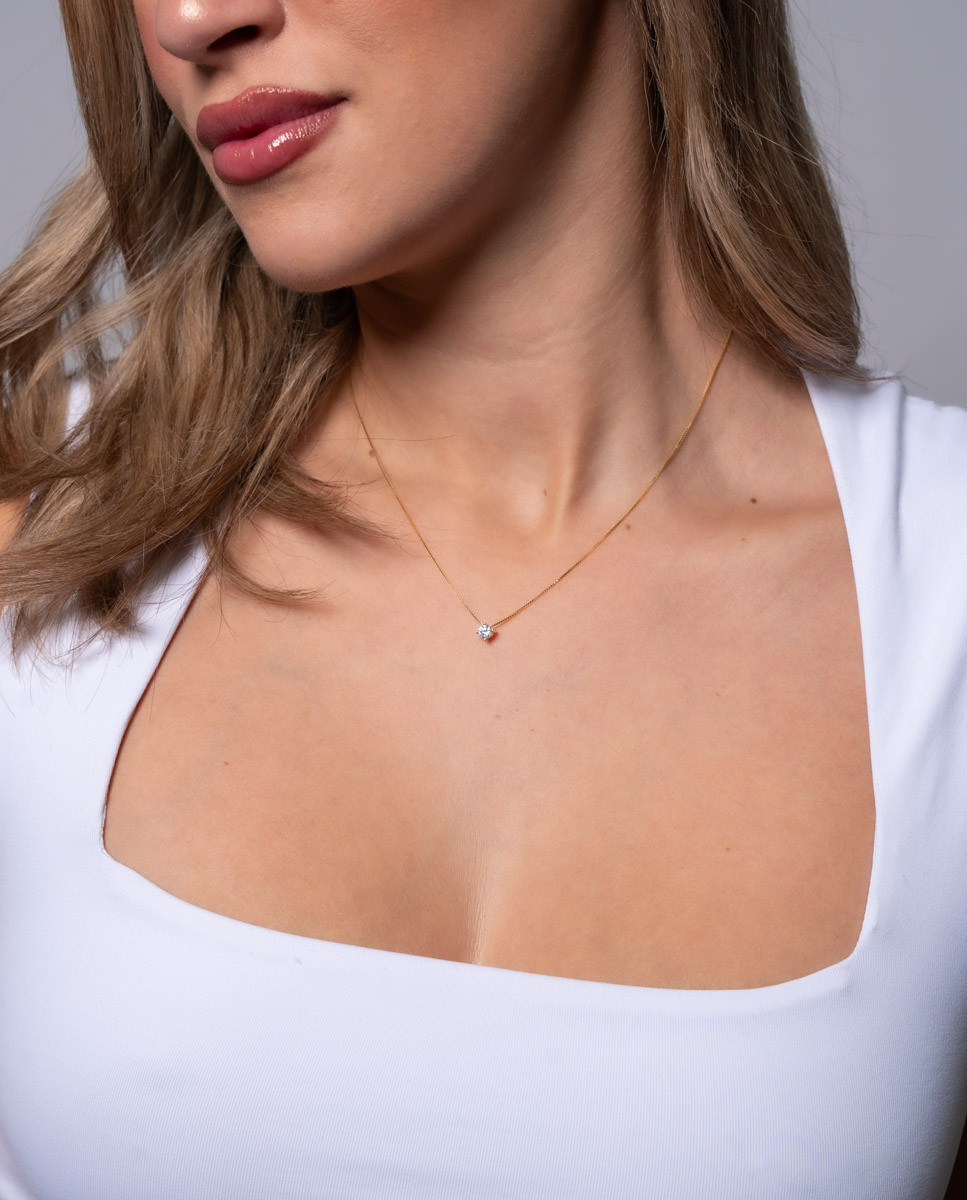 Collar de plata de ley 925 bañada en oro 18K con colgante de circonita blanca de 4 mm de diámetro engastada en cuatro garras, cierre tipo reasa y largo de 38 cms más 4 cms de alargador.