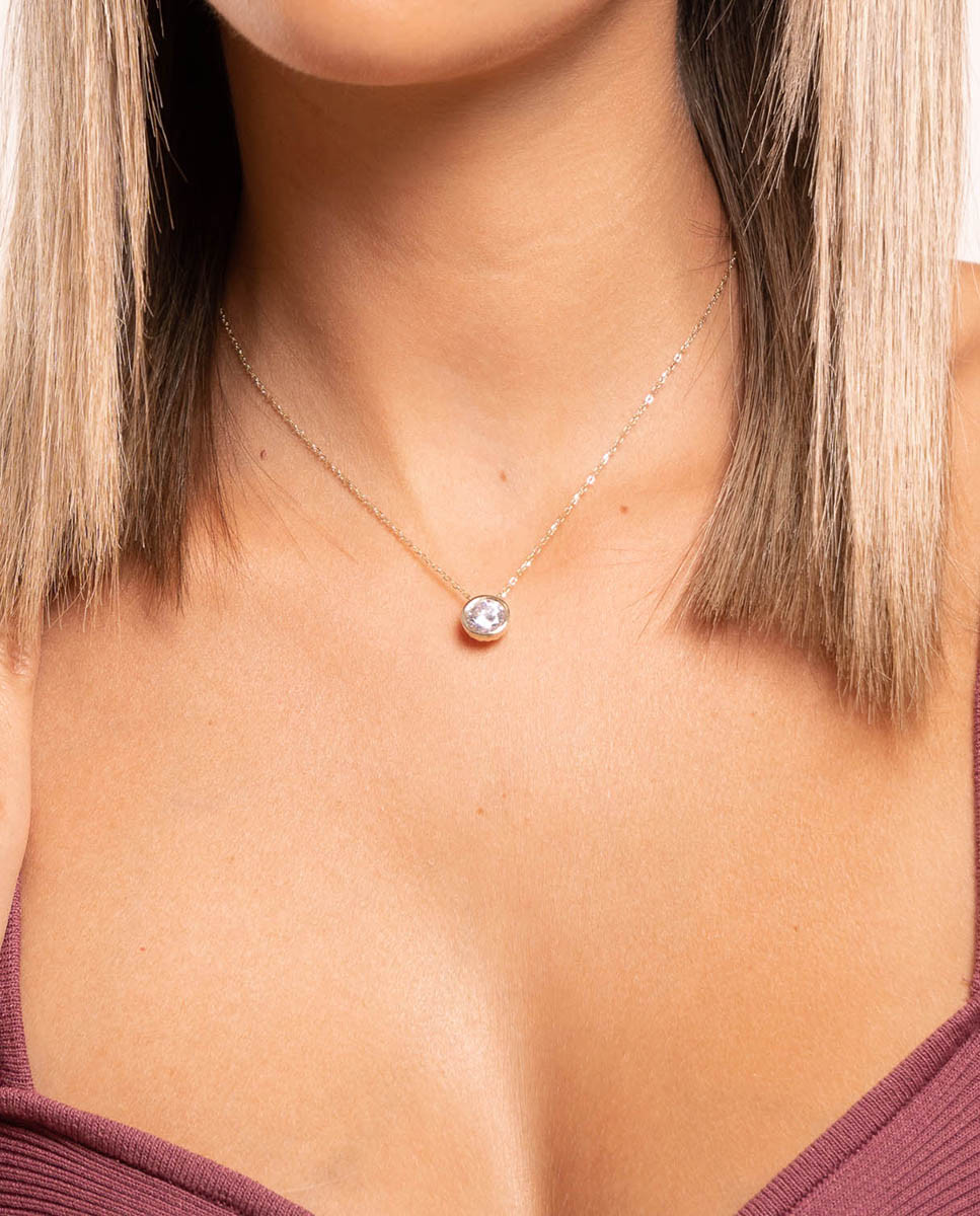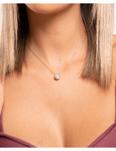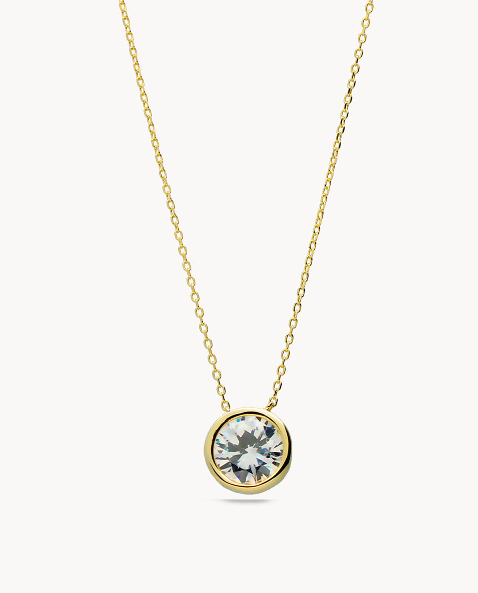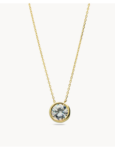 Collar de plata de ley 925 bañada en oro con chatón de circonita blanca de 10 mm de diámetro, cierre tipo reasa y largo de 38 cms más 4 cms de alargador.