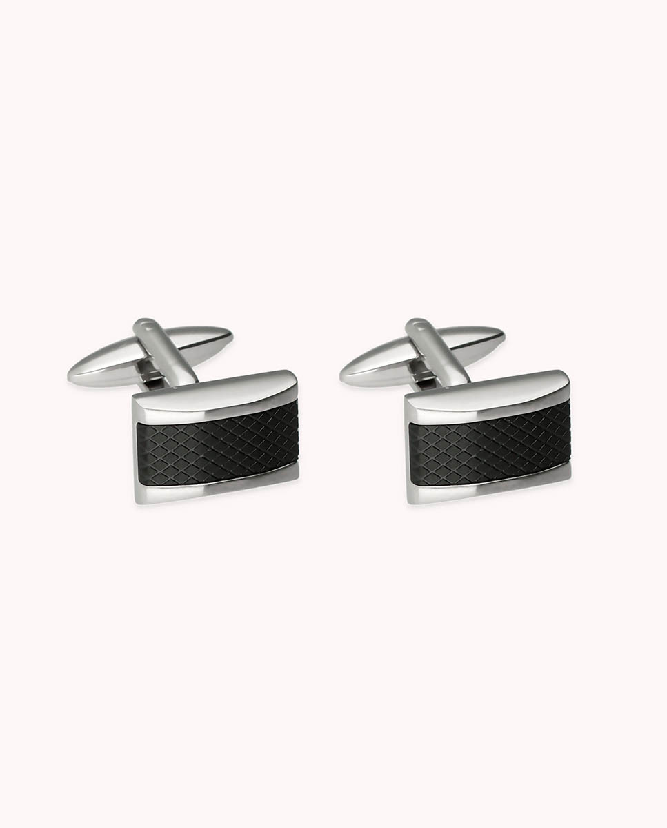 Gemelos de acero inoxidable con parte central epoxi negro y forma rectangular.