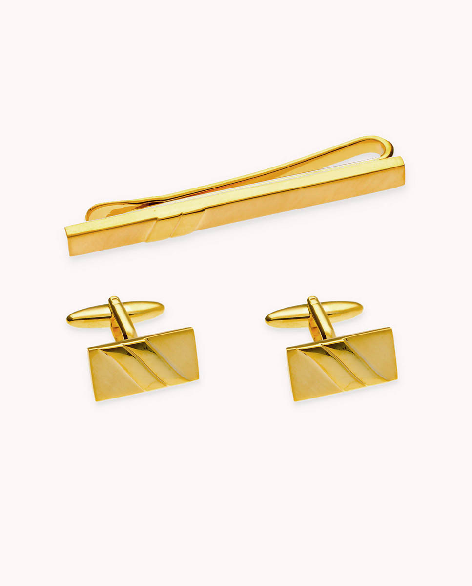 Juego de gemelos y pasador de corbata en metal bañado en oro combinado detalles matizados