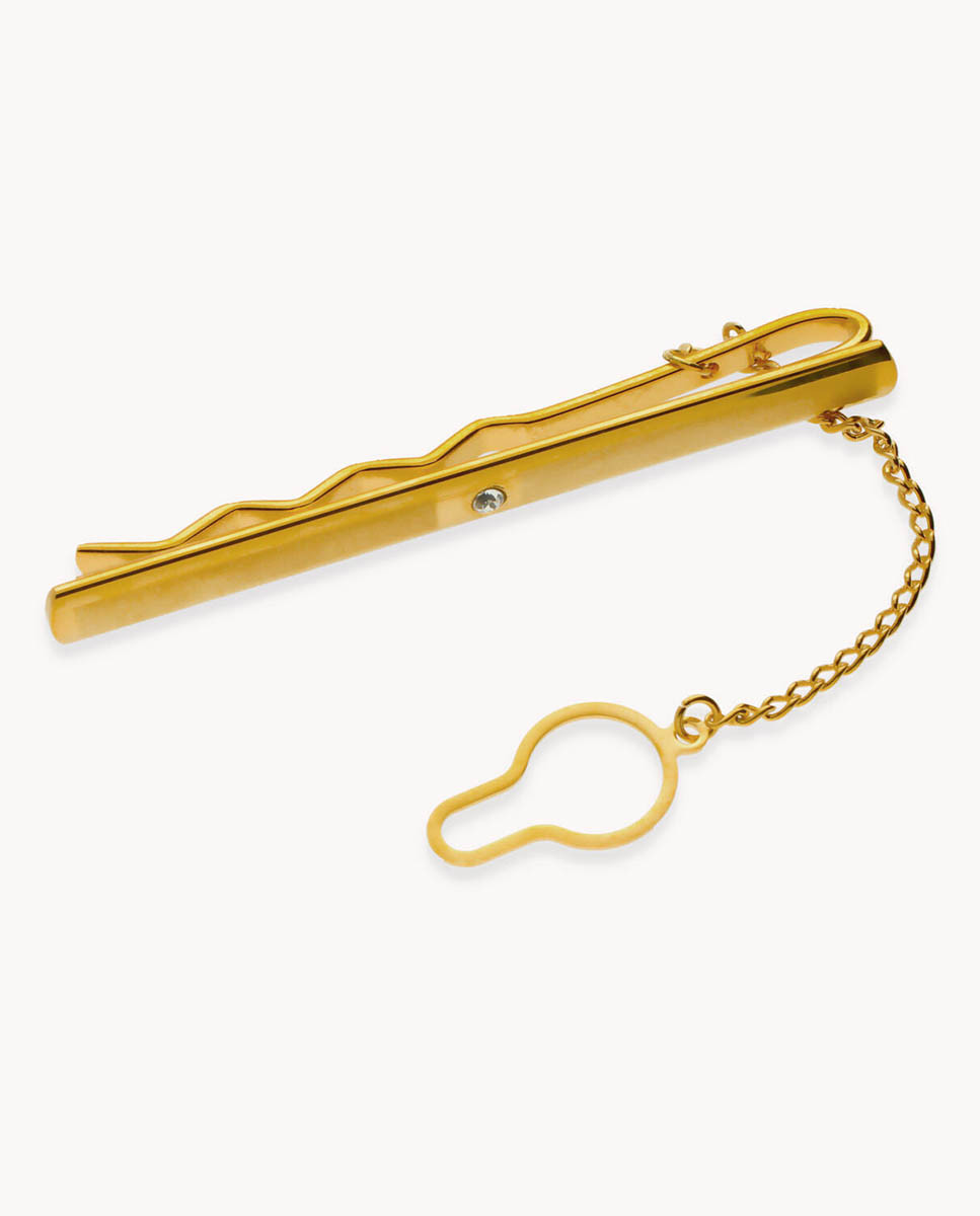 Pasador de corbata de metal bañado en oro con cadena de seguridad y detalle circonita blanca central.