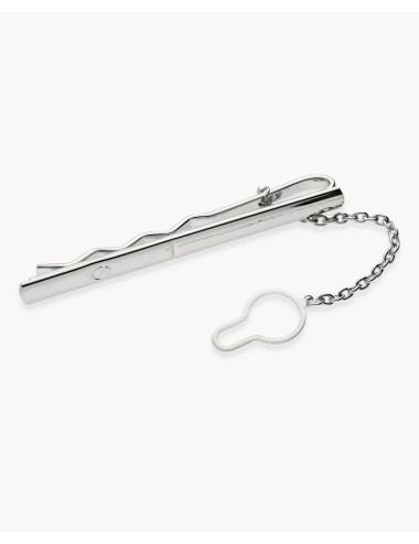 Pasador de corbata metal rodiado con cadena de seguridad y detalle clavo.