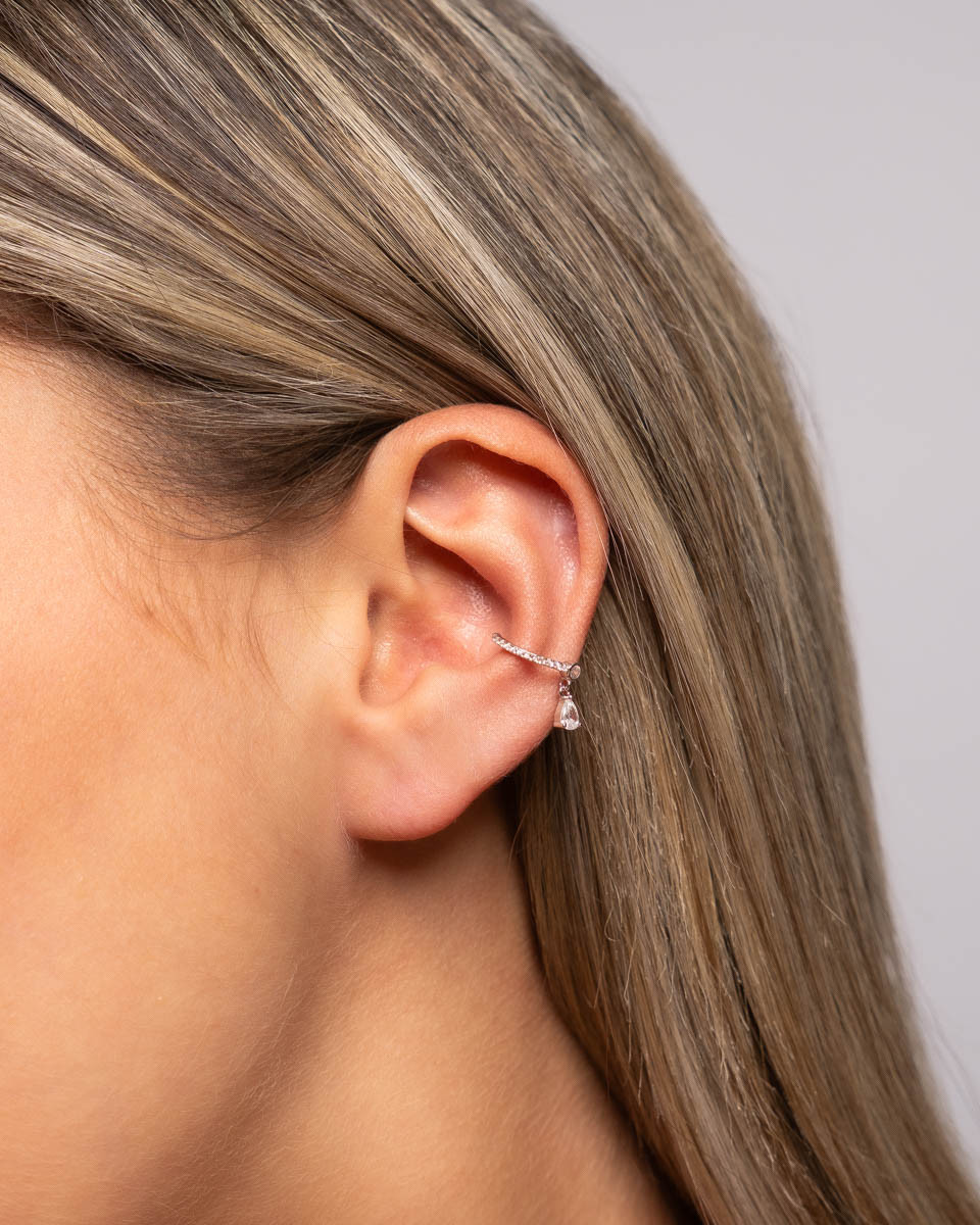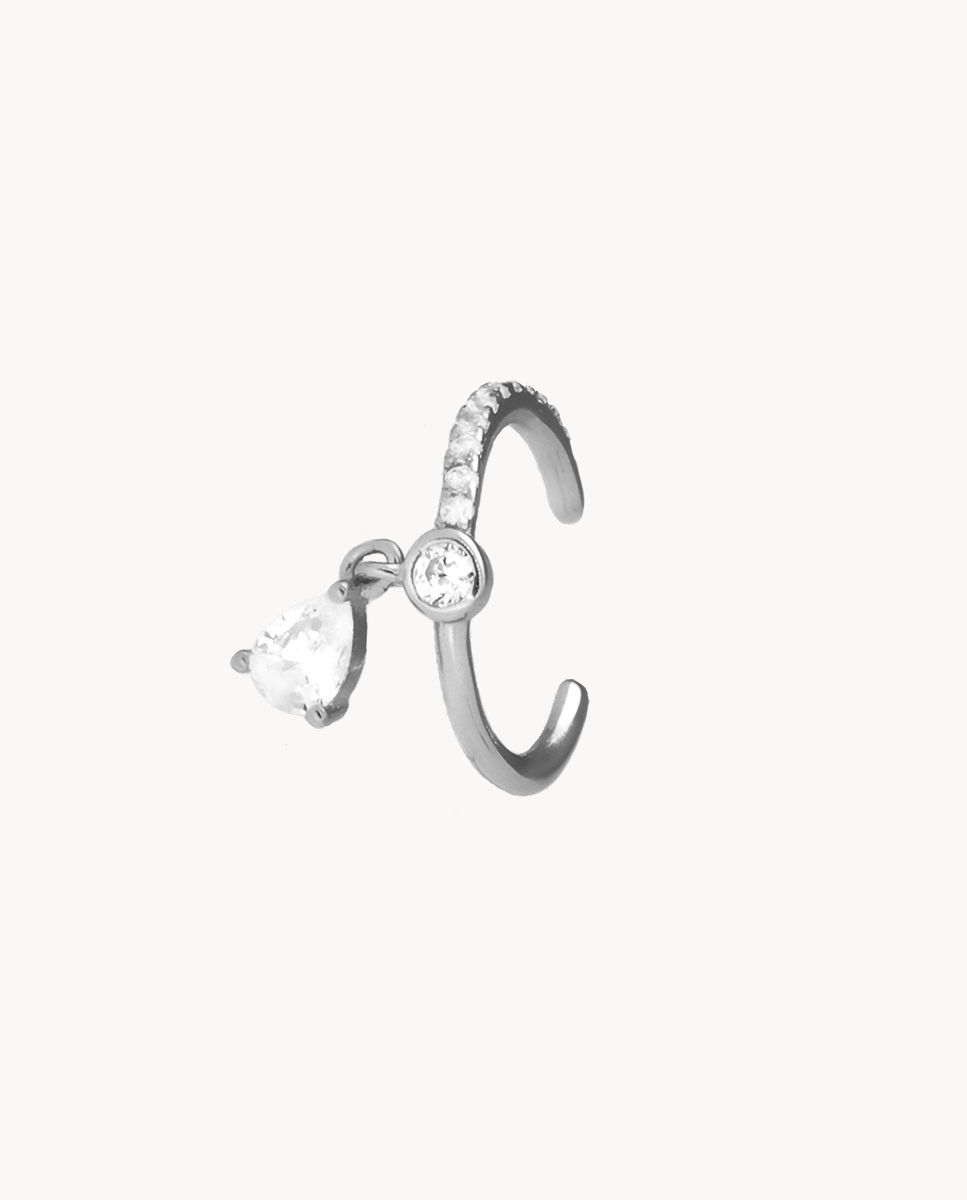 Pendiente individual ear cuff de plata de ley 925 bañada en rodio con circonitas en un lateral y colgante de gota de circonita blanca de 3 mm.