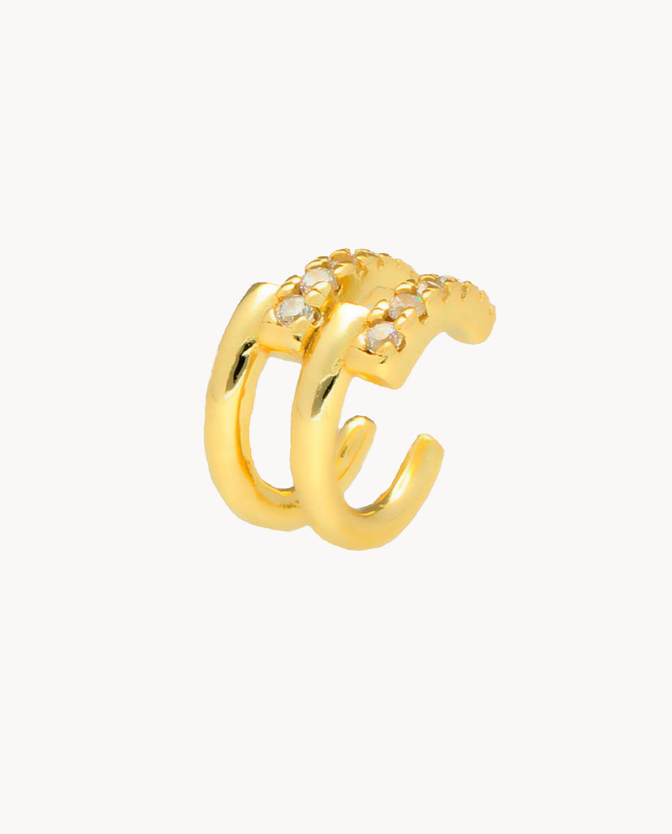 Pendiente individual ear cuff de plata de ley 925 bañado en oro con doble barra y circonitas blancas.