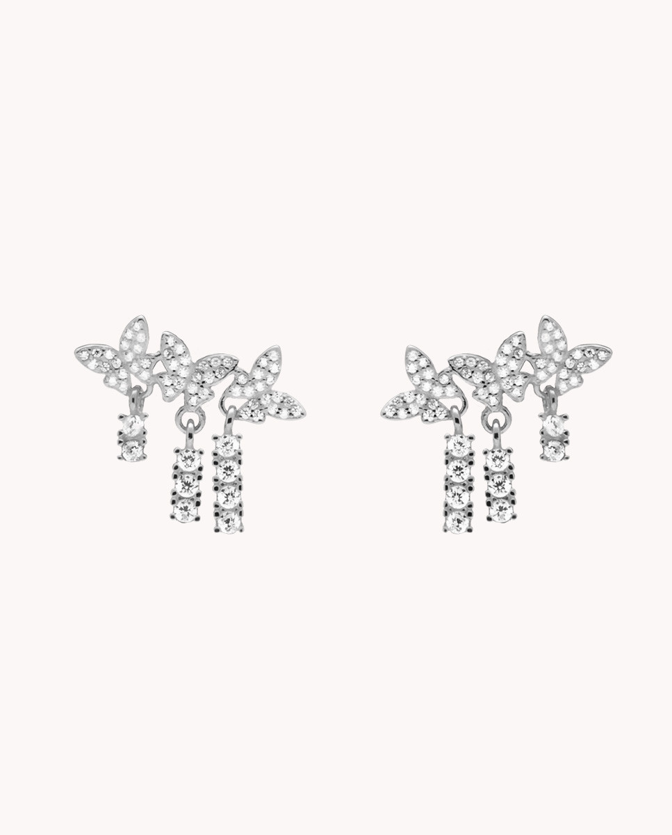 Pendientes de plata de ley 925 bañada en rodio con diseño de tres mariposas de 19 mm de ancho con circonitas blancas y cada una con colgante de circonitas en disminución de 6 a 3 mm de largo, cierre de presión.