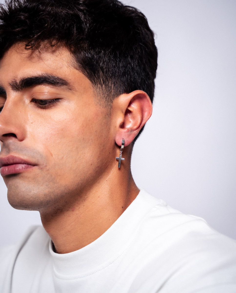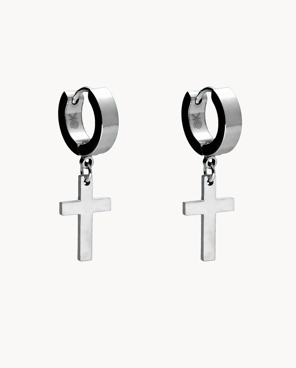 Pendientes de aro de acero inoxidable de 9 mm de diametro (interior) y 4 mm de grosor con cruz de 1,5 cm con movimiento y cierre africano.