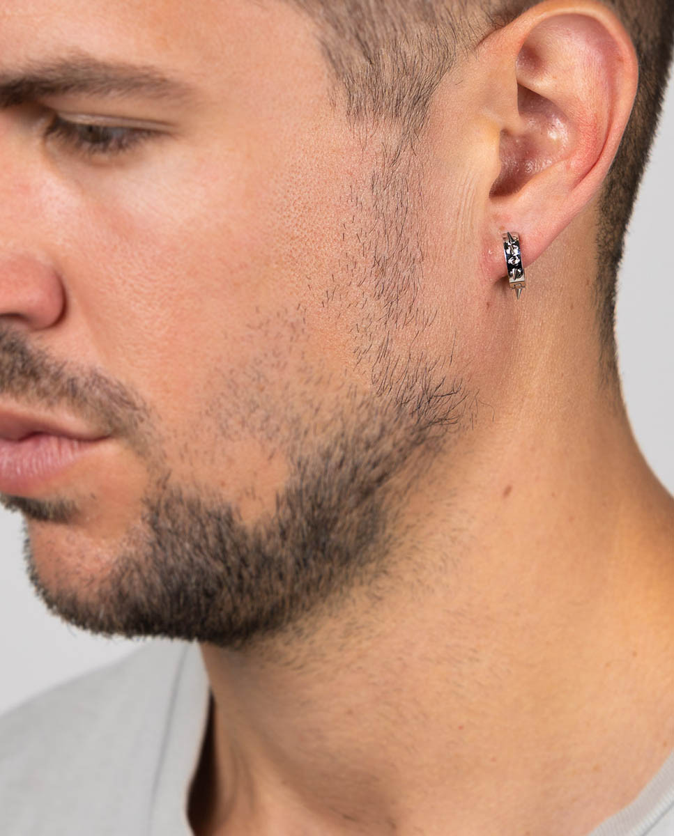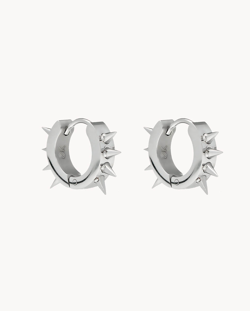 Pendientes de aro de acero inoxidable de 9 mm de diámetro interior y 4 mm de grosor, motivos de pinchos en todo el contorno y cierre africano.