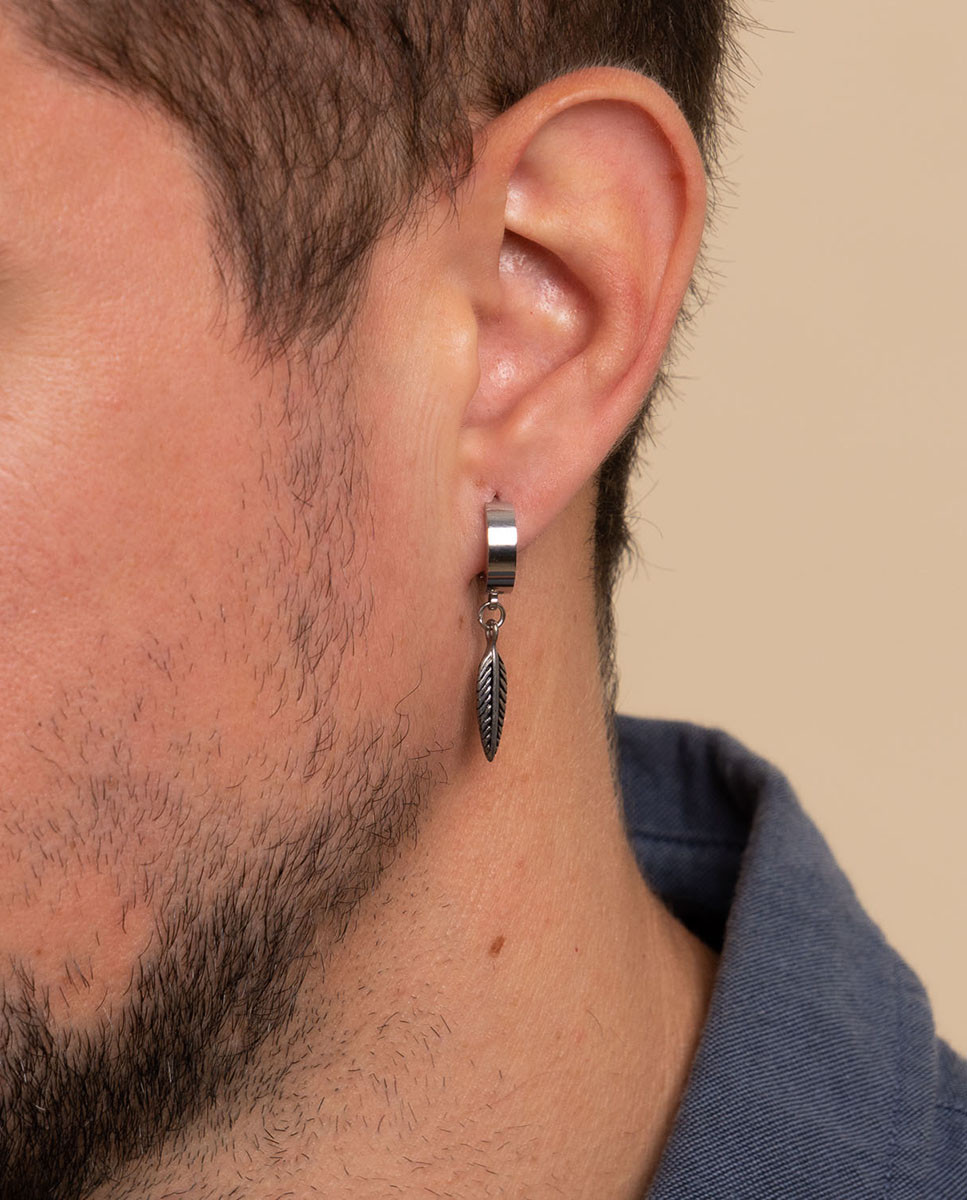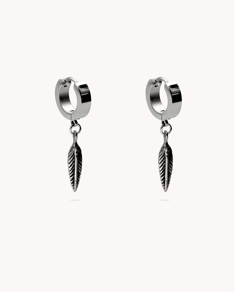 Pendientes de aro de acero inoxidable de 9 mm de diámetro (interior) y 4 mm de grosor con colgante de pluma de 1,5 cm y cierre africano.