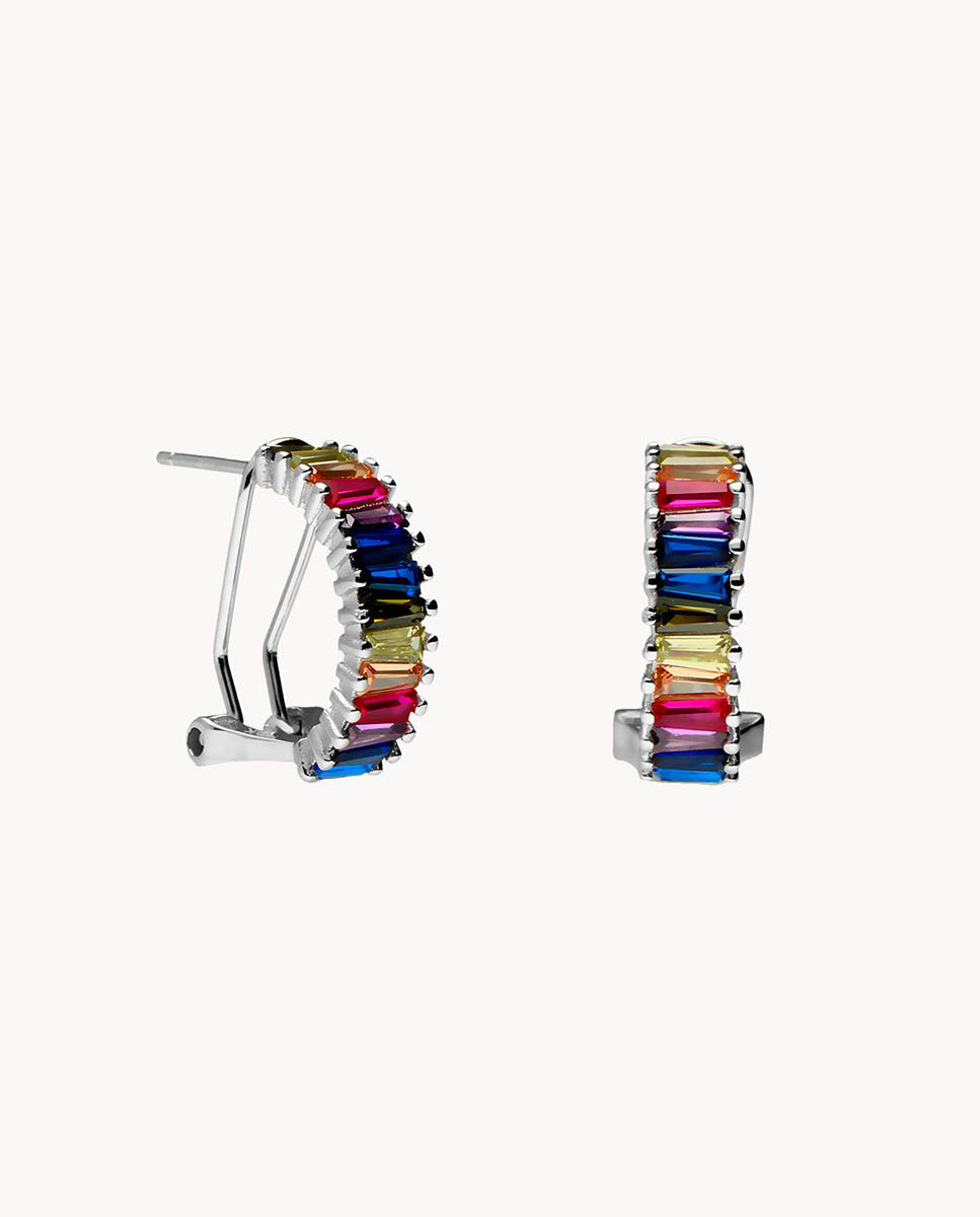 Pendientes de aro de plata de ley 925 bañada en rodio con circonitas multicolor talla baguette y 5 mm de ancho, cierre tipo omega.