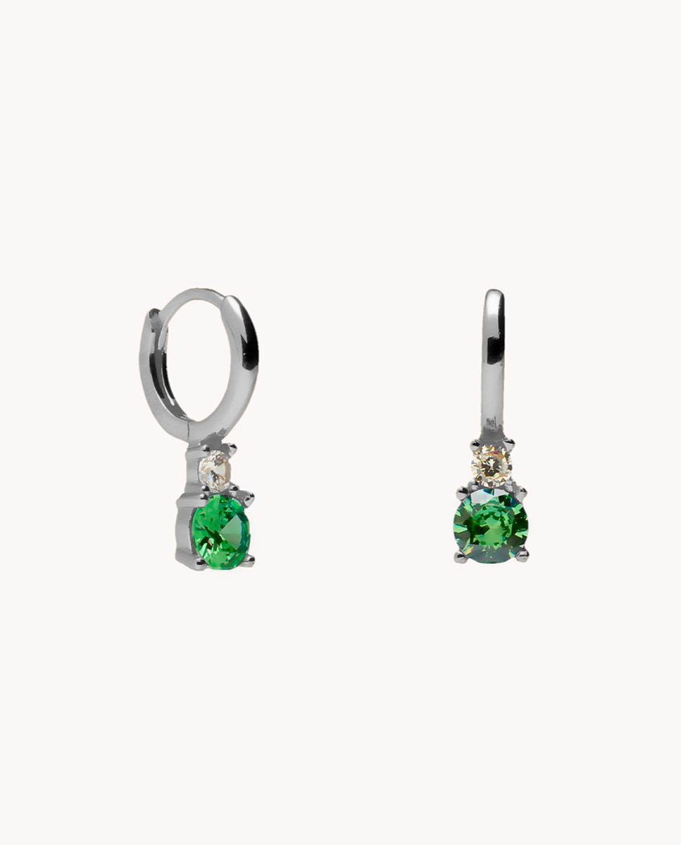 Pendientes de aro de plata de ley 925 bañada en rodio de 7 mm de diámetro interior y 1 mm de ancho con circonita blanca de 3 mm de diámetro y circonita color esmeralda de 4 mm de diámetro, cierre tipo africano.