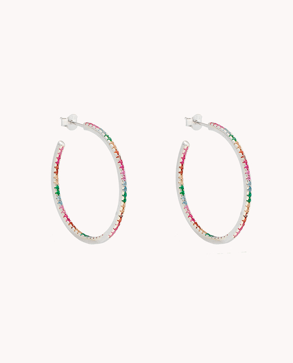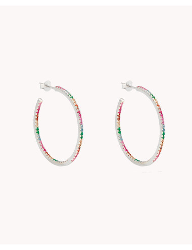 Pendientes de aro de plata de ley 925 bañada en rodio con circonitas multicolor de 18 mm de diámetro y 1,5 mm de ancho, cierre de presión.