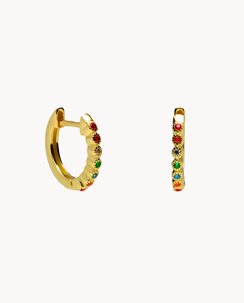 Pendientes de aro de plata de ley 925 bañada en oro de 10 mm de diámetro (interior) y 2 mm de ancho, circonitas multicolor y cierre africano.