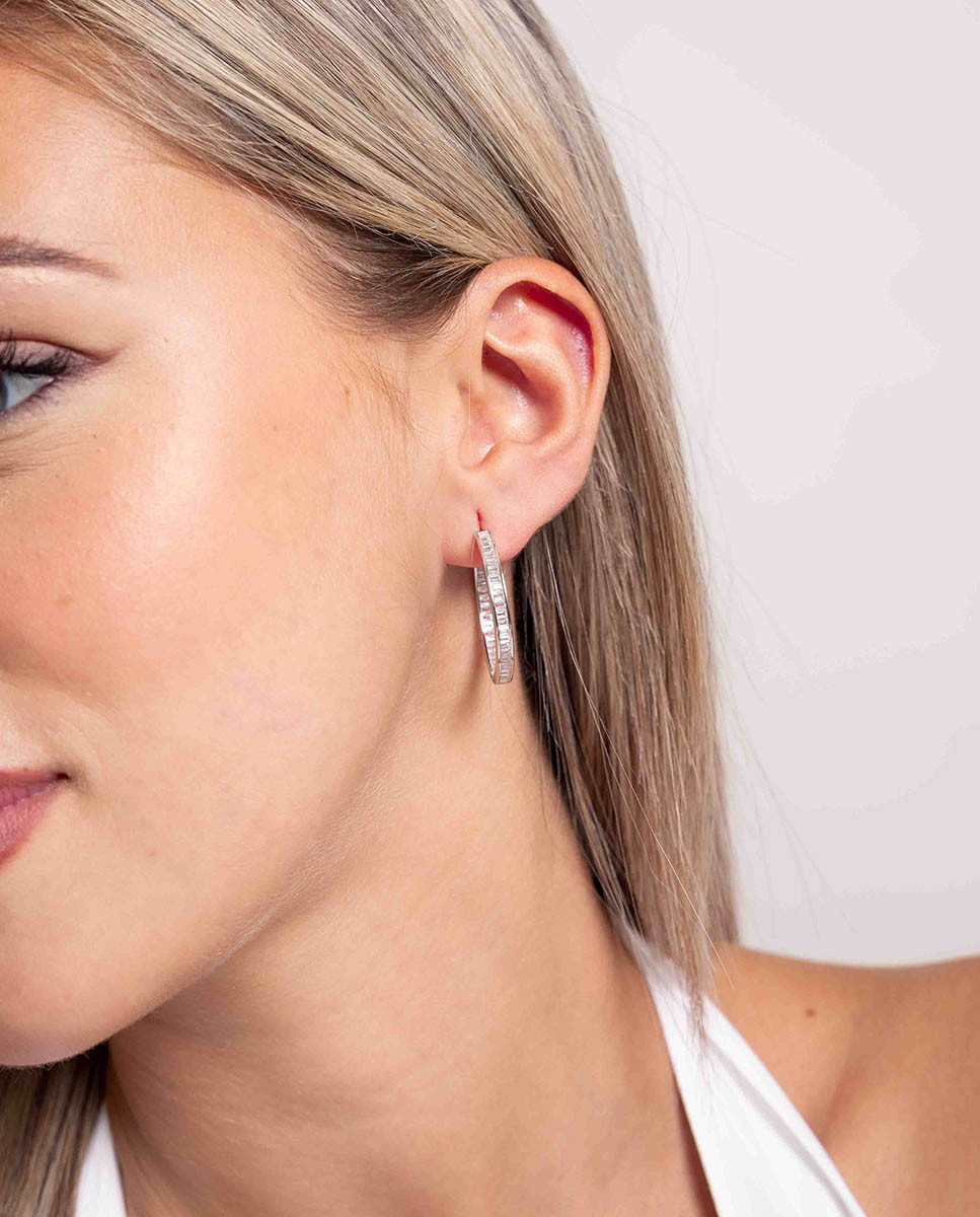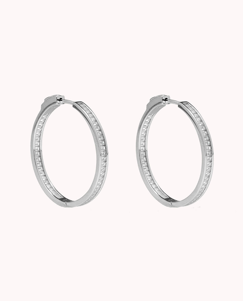 Pendientes de aro de plata de ley 925 bañada en rodio de 25 mm de diámetro interior y 3,5 mm de ancho, circonitas blancas talla baguette y cierre catalán.