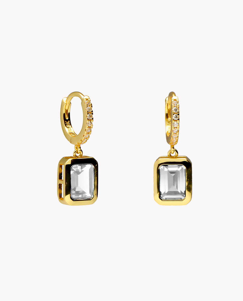 Pendientes de aro de plata de ley 925 bañada en oro 18K de 8 mm de diámetro interior y 2 mm de ancho con circonitas blancas, colgante en forma rectangular con circonita blanca de 6 mm x 8 mm (ancho por alto) y cierre africano.