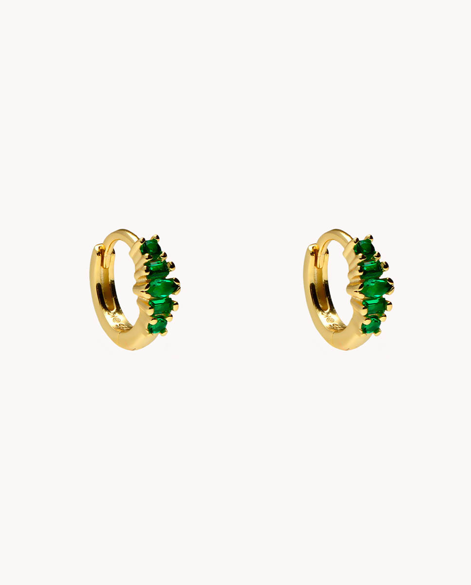 Pendientes de aro de plata de ley 925 bañada en oro 18K de 7,5 mm de diámetro interior y 2 mm de grosor con circonitas color verde esmeralda y cierre africano.